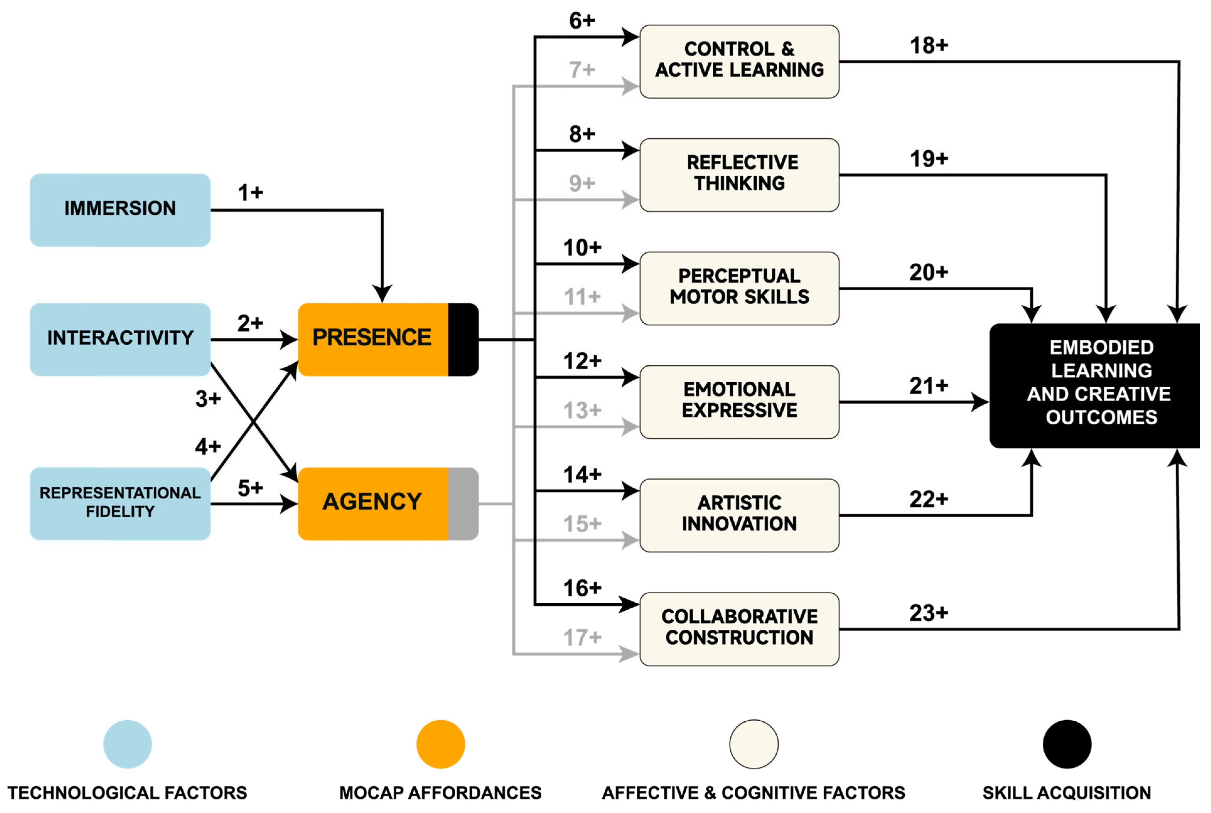 | Six mediators | Affective/cognitive mediators such as interest, intrinsic motivation, self-efficacy, embodiment, cognitive load, and self-regulation. | Control and Active Learning; Reflective Thinking; Perceptual Motor Skills; Emotional Expressive; Artistic Innovation; Collaborative Construction. |