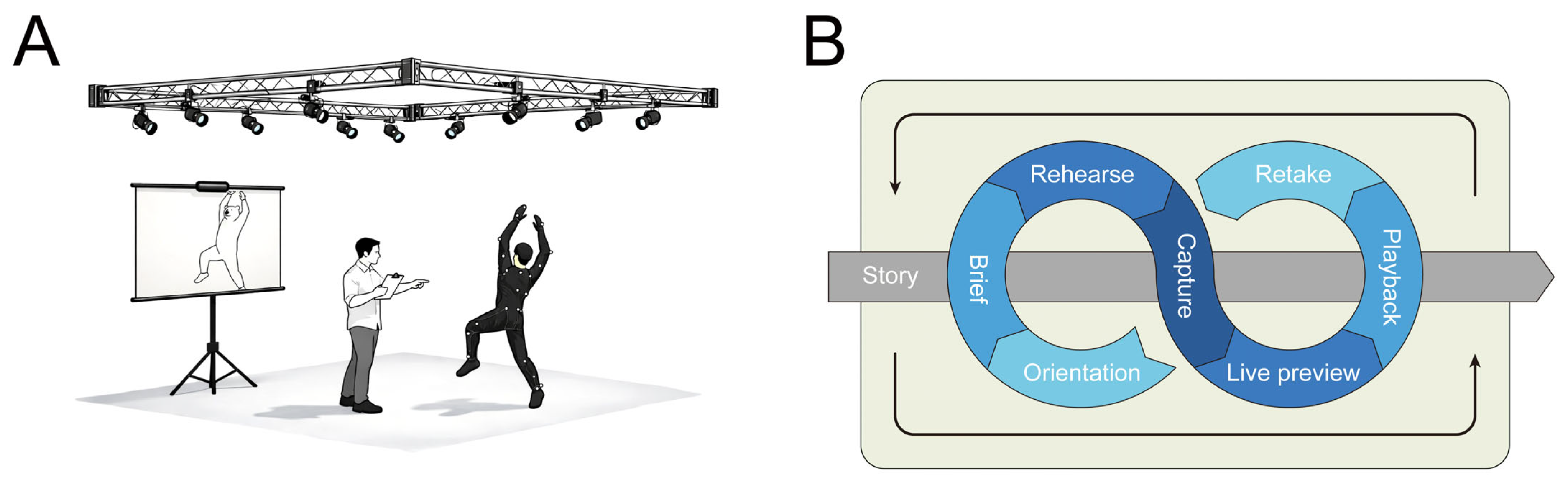 | Core interaction locus | Learner is situated in a simulated virtual environment and interacts with virtual content (often HMD-based). | Learner performs in the physical world; motion is captured, mapped to a character, and refined via capture–playback–retake cycles. |