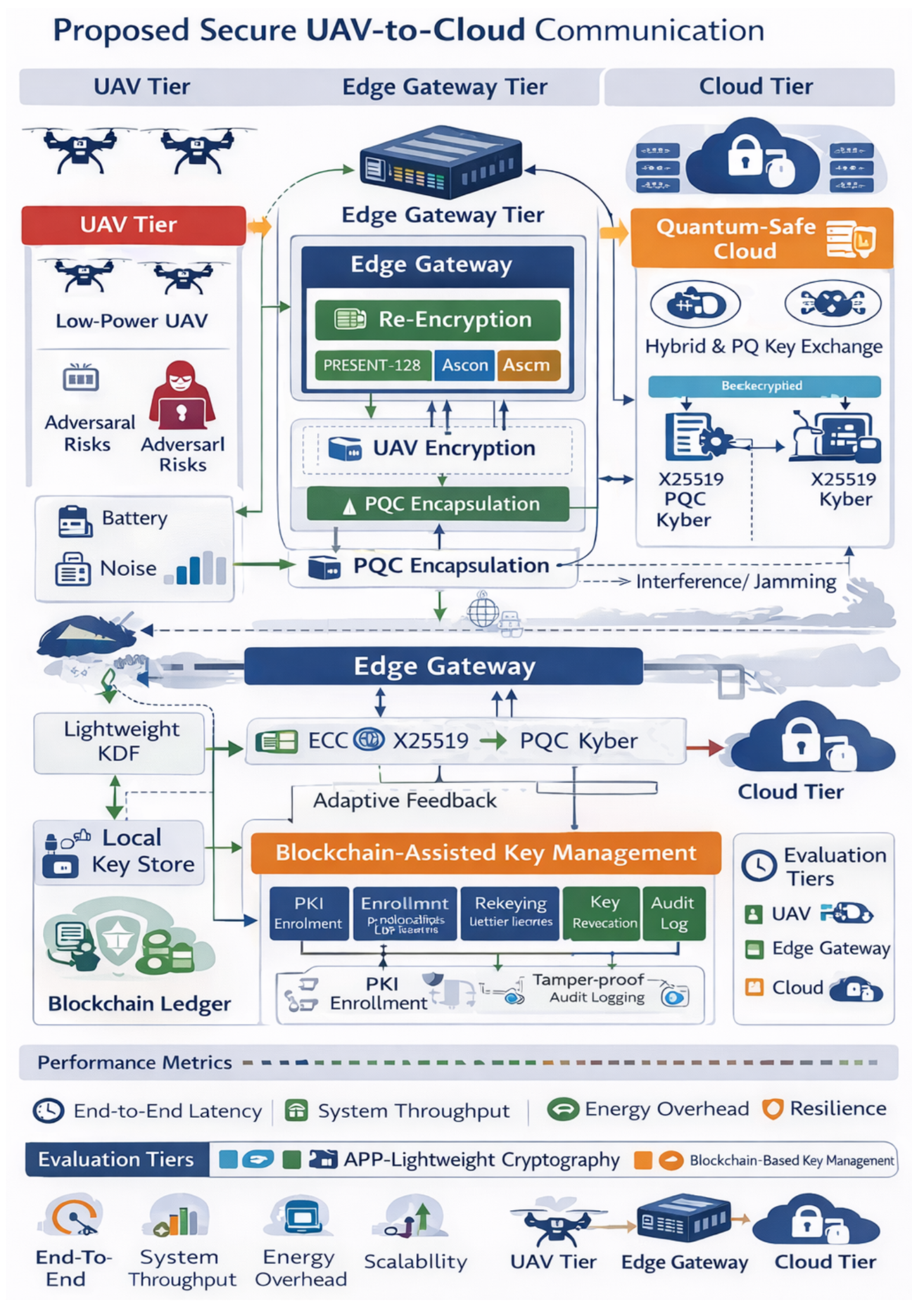 Importantly, the figure highlights that key management is a first-class component rather than an implicit dependency. The blockchain-assisted key management layer provides structured support for the complete lifecycle of cryptographic identities and keys, including PKI-assisted enrollment, periodic rekeying for forward secrecy, key revocation for rapid response to compromise, and immutable audit logging for accountability and non-repudiation. This enables scalable swarm operation by ensuring that key updates and trust decisions can be enforced without centralized single points of failure, while still keeping UAV-side overhead low through lightweight KDF-based session keys and local ephemeral storage. The explicit inclusion of evaluation tiers and performance metrics (end-to-end latency, throughput, energy overhead, resilience, and scalability) further reinforces that the methodology is not purely conceptual: it is designed to be experimentally verifiable, with measurable security–performance trade-offs at each stage (UAV encryption, gateway re-encryption, hybrid/PQ key exchange, and blockchain governance). Collectively, the architecture captures a coherent methodology where adaptive cryptography, gateway-centric hybridization, and auditable key management jointly deliver a practical, quantum-resilient security framework for UAV-to-cloud deployments.