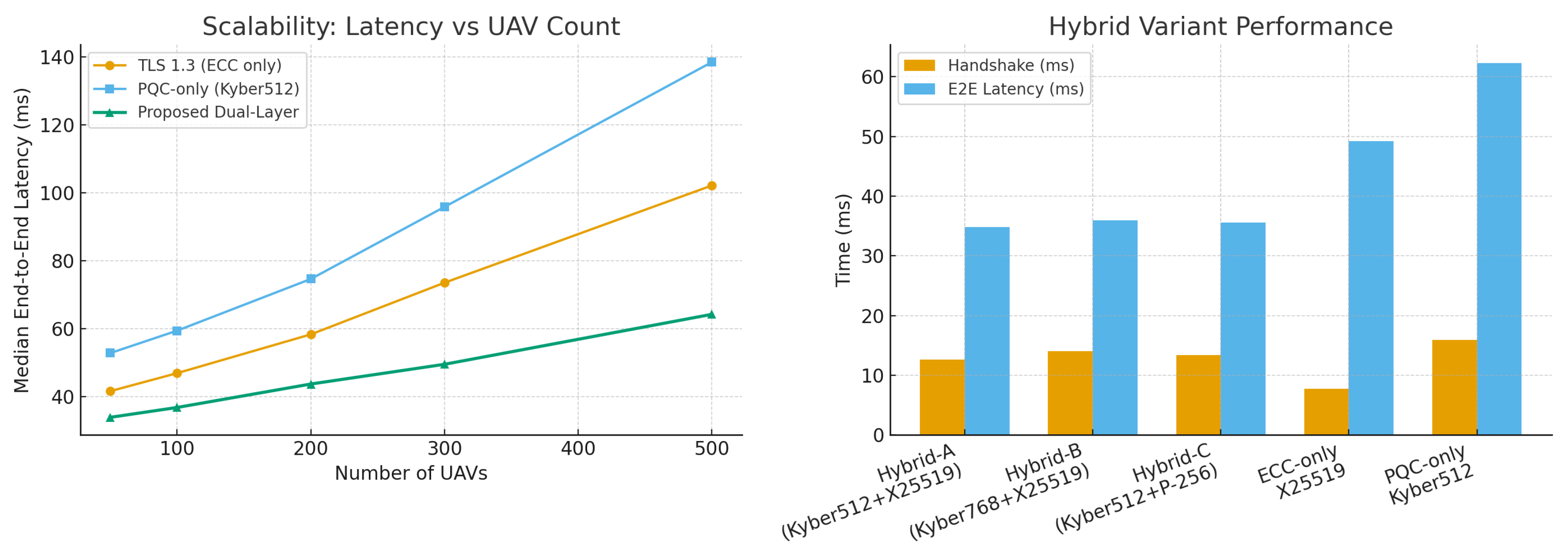 Figure 3. The proposed dual-layer architecture consistently maintains the lowest median end-to-end latency across increasing UAV swarm size, as shown by the scalability curve. At 500 UAVs, it sustains only 64 ms, compared to 102 ms for TLS 1.3 and 138 ms for PQC-only Kyber512. These results show that, in large-scale deployments, adaptive ciphering at the UAV tier and hybrid encapsulation at the gateway greatly reduce communication delays. The bar chart of hybrid variants further reinforces these findings: Hybrid-A (Kyber512 + X25519) outperforms both ECC-only and PQC-only baselines, achieving the best trade-off with the lowest end-to-end latency (34.8 ms) and a combined handshake time (12.6 ms). Stronger PQC parameter variants, such as Kyber768, incur marginally higher latency, demonstrating the framework’s flexibility in adjusting the security–performance balance based on mission requirements.