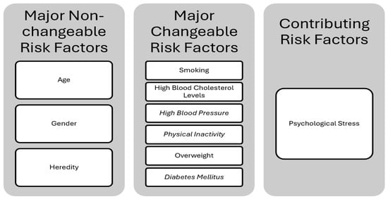 Psychological stress, acute or chronic, is a major cardiovascular risk factor that can trigger heart attacks and strokes and accelerate damage from other risks. It harms heart health through emotional outbursts, job strain, and depression, making mental well-being essential for heart disease prevention [19,20]. Figure 6 below divides risk factors for cardiovascular disease (CVD) into three categories. Major non-changeable risk factors are inherent and cannot be modified. Conversely, major changeable risk factors represent behaviors or conditions that can be managed or altered to significantly reduce risk, alongside other contributing risk factors like psychological stress.