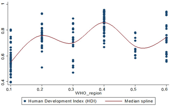 Initially, before estimating the models for counting data, we tried to investigate by evaluating a regression model country represented by the Equation (14), whether there are differences between the mean HDI values of the 188 WHO member countries grouped into six regions, using the African region (AFRO) as the reference of the regression model. These results are presented in Table 3.