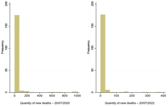 It is observed that 104 and 138, that is, 55.32% (20 July 2020) and 73.4% (20 July 2022) of the countries analysed, did not present any occurrence of death on the date under analysis (22 July 2022), although preliminary data indicates the existence of an excessive amount of zeros in the dependent variable, which are new deaths after the application of the first dose of vaccine.