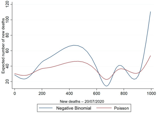It will be performed by defining the most appropriate and consistent regression model through the elaboration of a diagnosis on the behaviour of the distribution of the mean and variable of the dependent variable (number of new deaths), considering whether or not (i) overdispersion in the data and (ii) inflation of structural zeros in the data, i.e., an excessive amount of zeros in the dependent variable. Thus, initially, a Poisson regression model will be estimated, from which the [55] will be elaborated to verify the existence of overdispersion in the data (variable statistically higher than its mean). The Equation (1) expresses the Poisson and NB2 regression models.