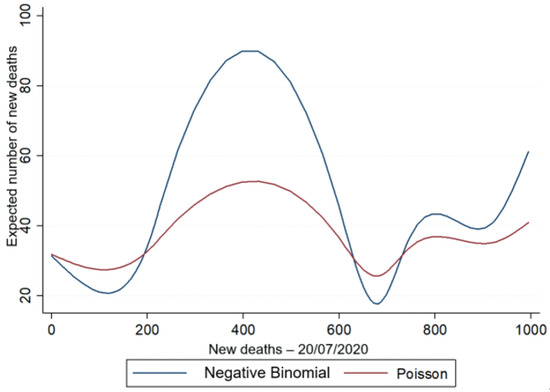 These results suggest that the estimation of an NB2 model presents the best estimator compared to that of a Poisson model. The χ2 test, comparing the observed and predicted probabilities distributions of new deaths, before (χ2 = 27,924.68; p = 0.00, panel A) and after the application of the first dose of the vaccine (χ2 = 6493.458; p = 0.00, panel B), also supports the lack of quality of Poisson regression model adjustment. There are statistically significant differences, at the significance level of 5%, between the observed and estimated probability distributions (predicted) of the number of new deaths before and after the application of the first dose of the vaccine.