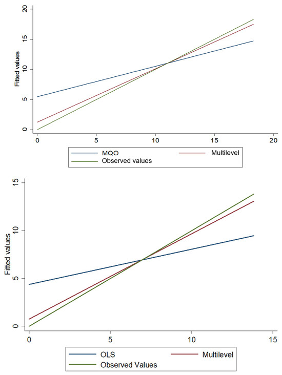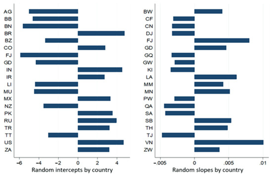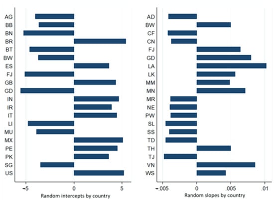 where ρ represents the intraclass correlation coefficient ranging from 0 to 1, a null value means that there was no variable of individuals between the groups of level 2 (country), so estimates of multilevel regression models are not the most appropriate, and a value greater than zero, given by the presence of at least one statistically significant error term of level 2 suggests that the estimates of regression parameters by minimums are not suitable. To this end, the likelihood-ratio test (LR) is analysed to verify whether the error terms of the random effect variable components of intercepts () and slopes (), see Equation (12) are statistically different from zero.