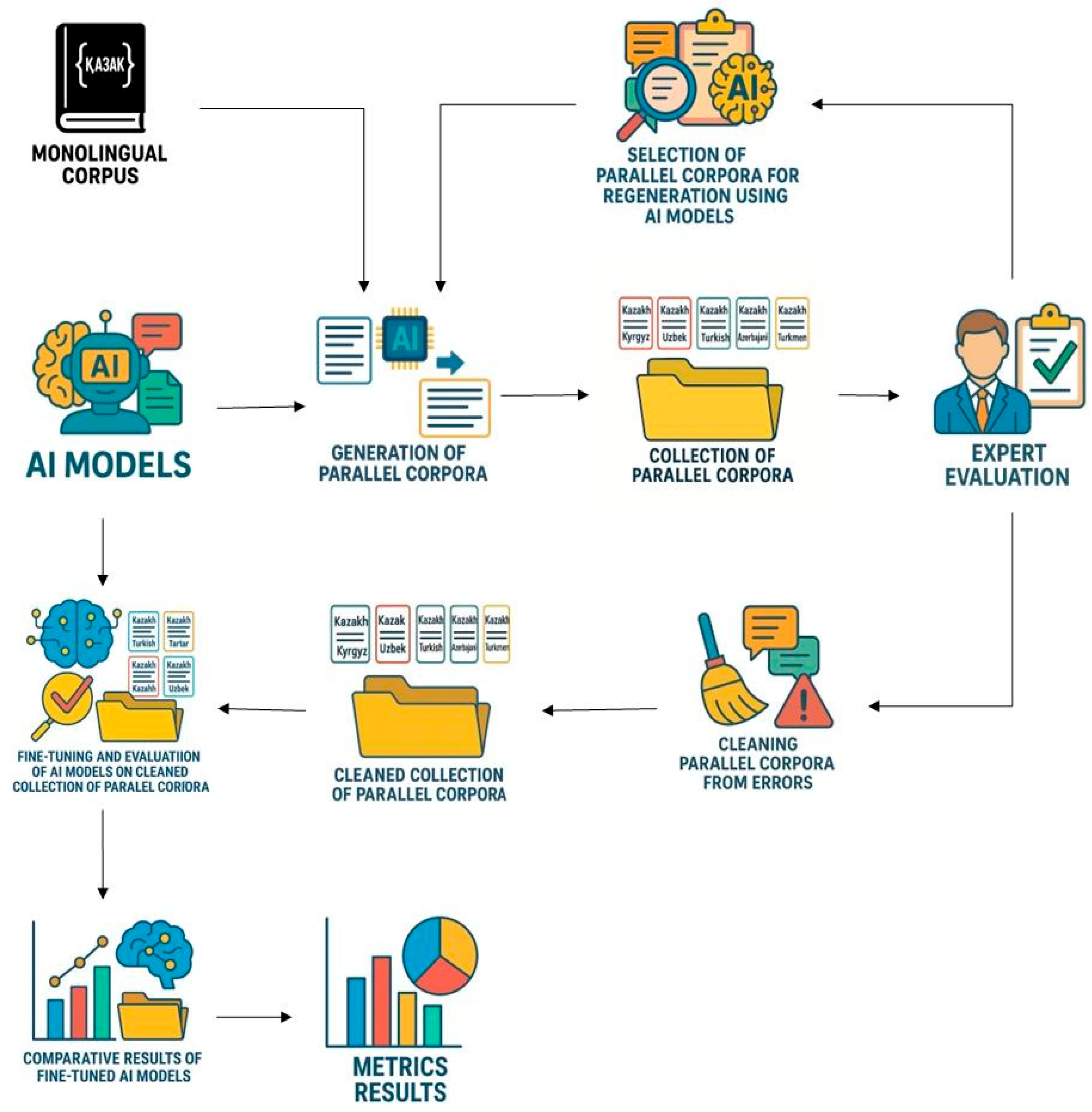 Section 2.1) relies heavily on the availability of parallel corpora, making the expansion and cleaning of Turkic–Kazakh datasets critical.