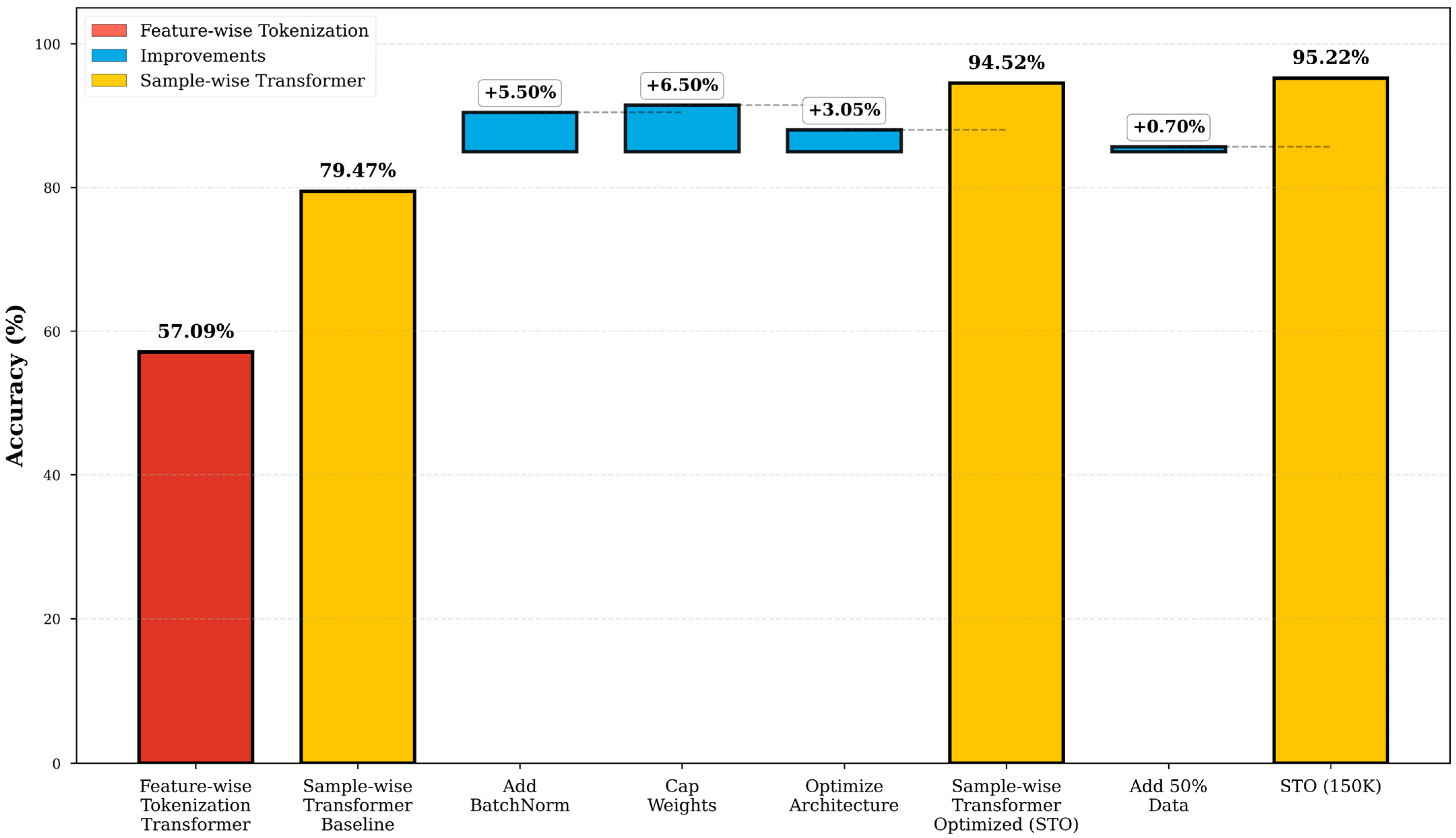 - STB: 79.47% accuracy with sample-wise tokenization but no normalization or weight capping. This establishes the performance floor for per-sample approaches.