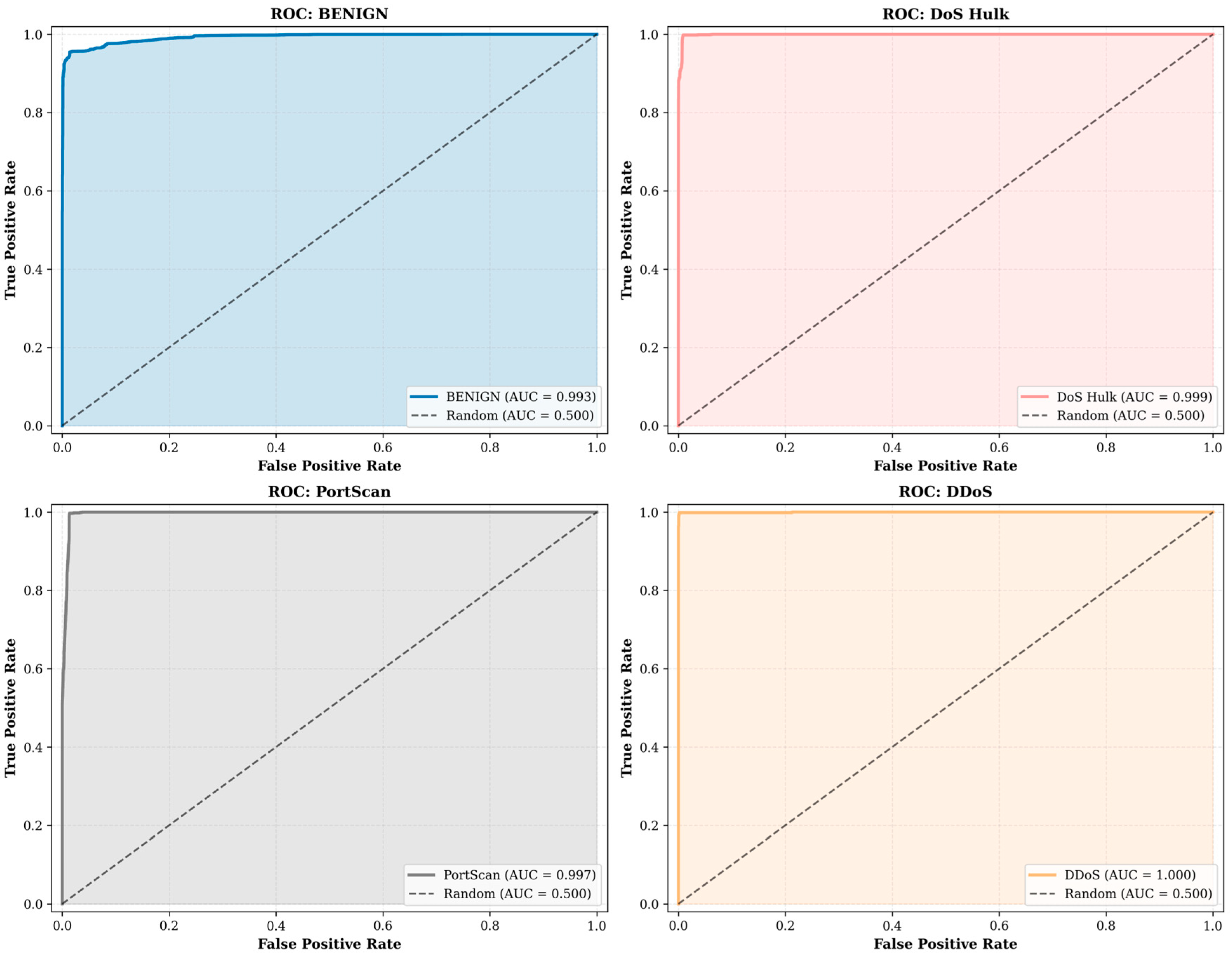 - The per-class ROC curves for DDoS (AUC = 1.000), DoS Hulk (AUC = 0.999), PortScan (AUC = 0.996), and BENIGN traffic (AUC = 0.994) demonstrate near-perfect class separability. These results confirm that the optimized architecture effectively captures the distinctive patterns characteristic of high-frequency attack categories.