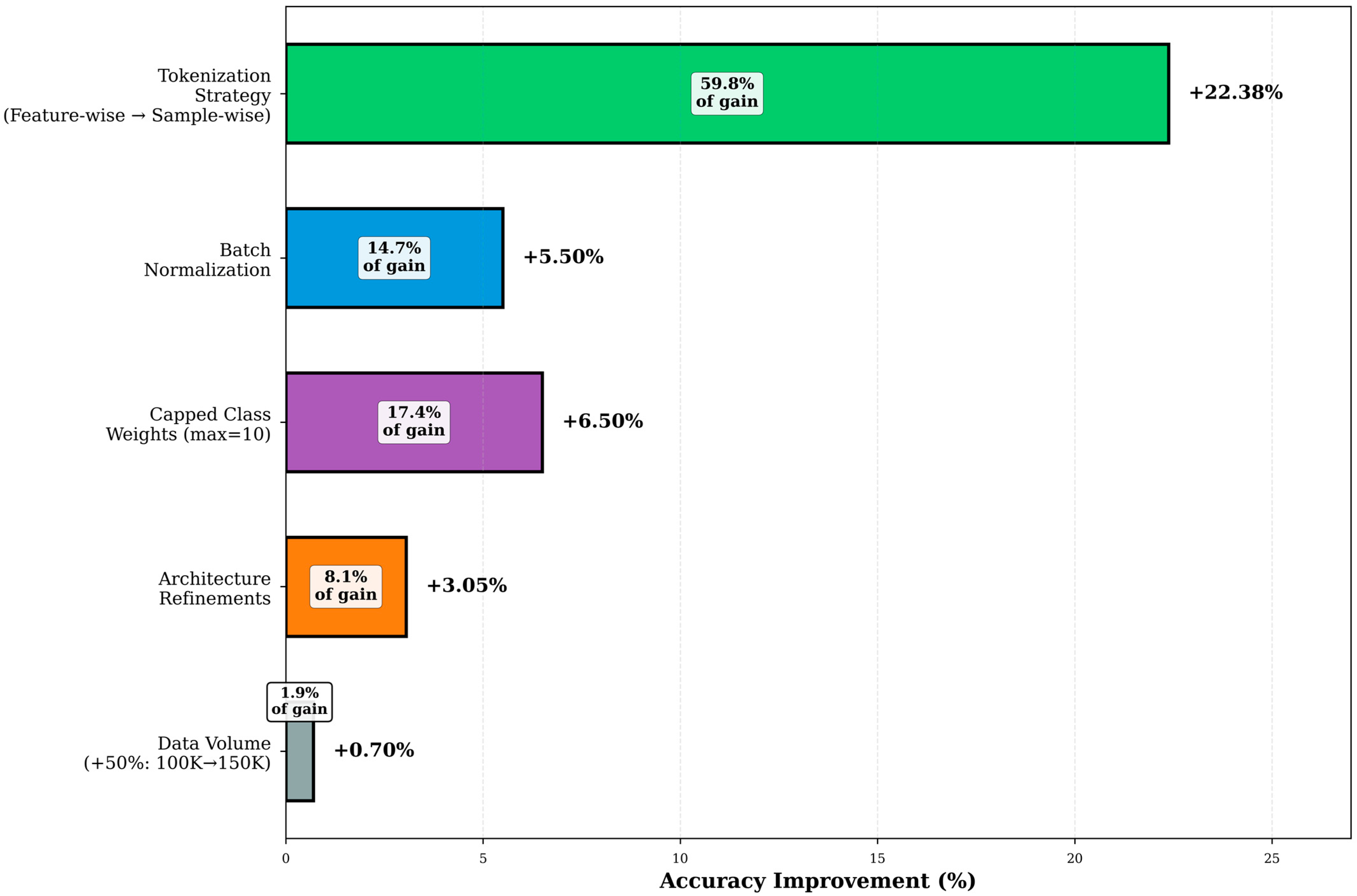 - Tokenization emerges as the primary contributor of performance gains: the transition from per-feature to sample-wise tokenization accounts for 59.8% of the overall improvement, establishing it as the dominant factor. This finding indicates that representation design plays a fundamental role in determining model performance when applied to tabular IDS data.