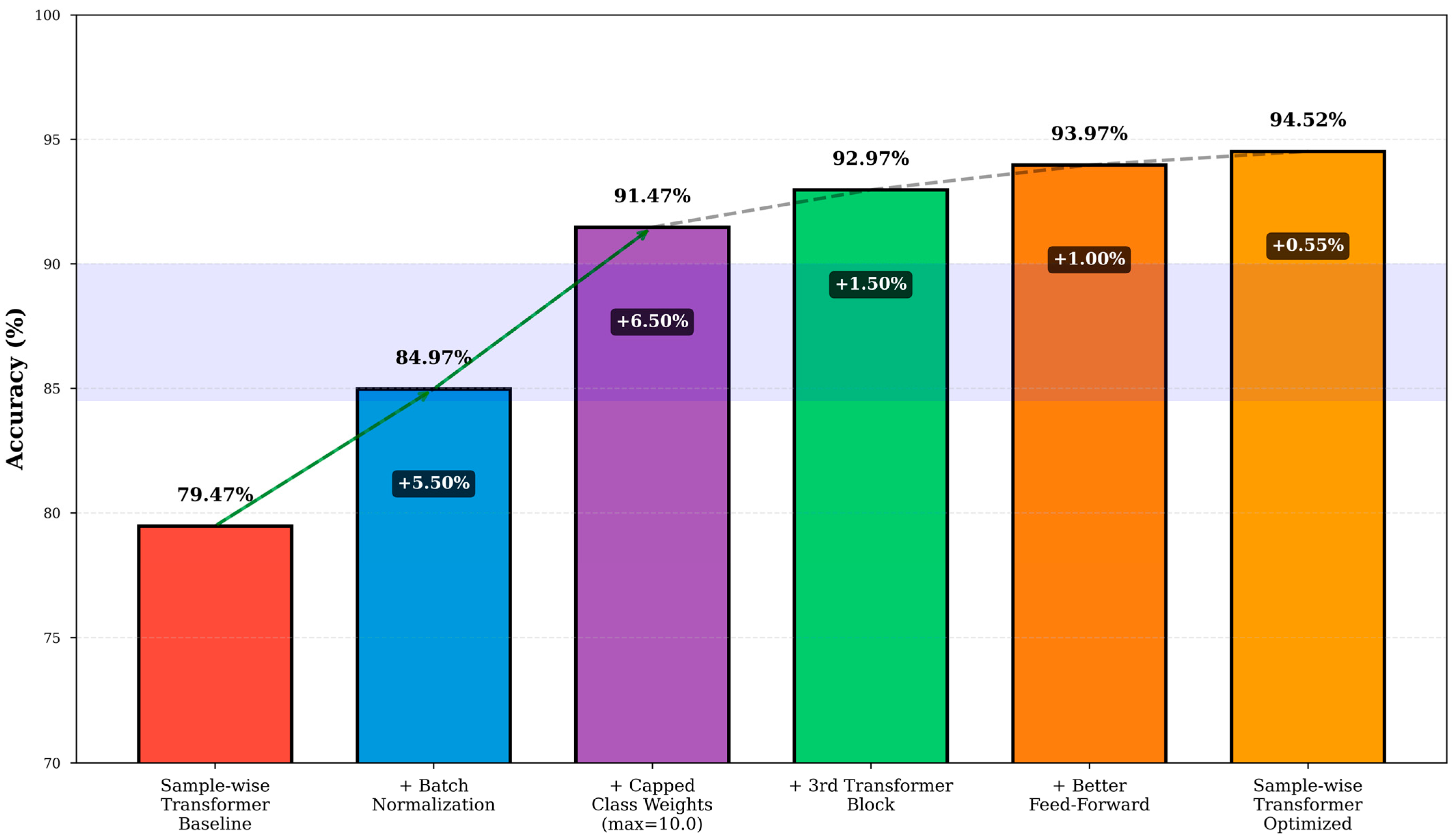 - Additional Transformer Block: 92.97% accuracy (+1.50 points). Increasing depth from 2 to 3 blocks provides additional representational capacity.