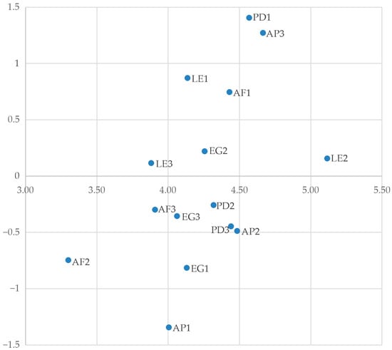 The weighted supermatrix was iterated to convergence using Equation (A13) (Table 8). Under the regularity condition, the columns of W(∞) converge to the same priority vector . The resulting global DANP weights (descending order) are: PD1 = 0.095, AP3 = 0.092, LE2 = 0.082, AF1 = 0.081, LE1 = 0.077, EG2 = 0.072, LE3 = 0.065, AP2 = 0.064, PD3 = 0.062, PD2 = 0.062, AF3 = 0.059, EG3 = 0.058, EG1 = 0.051, AP1 = 0.042, AF2 = 0.037.