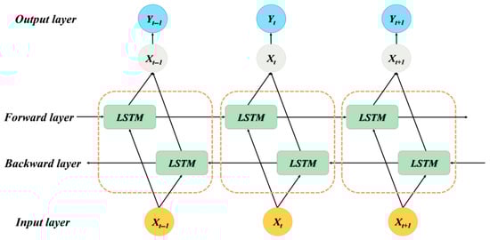 However, information flows in one direction in LSTM networks. In other words, the LSTM model can only learn historical information. Given the intricate interaction between input sequences, our study chose the Bi-LSTM network as the prediction model to enhance the forecasting performance. The Bi-LSTM is made up of two LSTM layers in opposite directions and can process both historical and future data. The specific structure of the Bi-LSTM is depicted in Figure 3. Specifically, arrows show the direction of information flow. And the core Bi-LSTM unit is illustrated in the dashed frame.