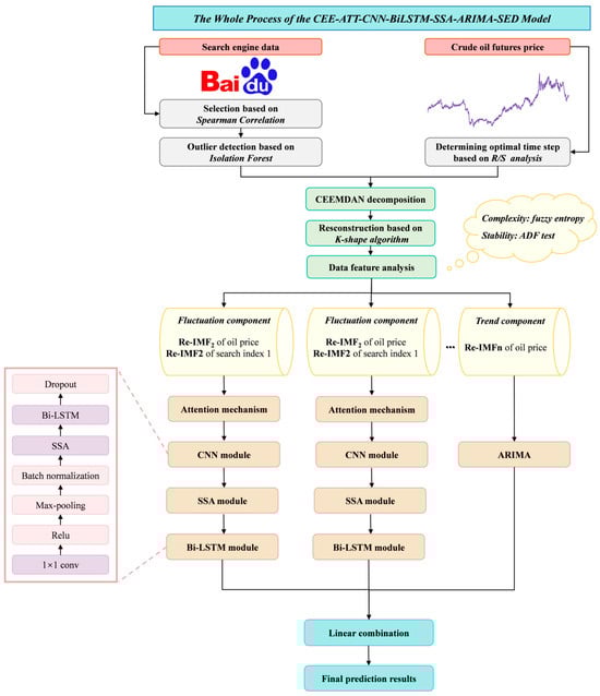 In conclusion, this study presents a crude oil futures price prediction model utilizing multi-source features named CEE-ATT-CNN-BiLSTM-SSA-ARIMA-SED. This model integrates cutting-edge deep learning models and an attention mechanism, which are specifically designed to address the high volatility of crude oil futures markets. More specifically, the historical crude oil futures prices and corresponding search engine data (SED) are decomposed and reconstructed using the Complete Ensemble Empirical Mode Decomposition with Adaptive Noise (CEEMDAN) and K-shape clustering algorithms, respectively. The reconstructed sub-sequences are then divided into trend and fluctuation components based on the ADF test results and the fuzzy entropy (FE) value. Next, the ARIMA and CNN-BiLSTM-SSA fused attention mechanism are employed to forecast trends and fluctuations, respectively. The main contributions of this work are as follows: