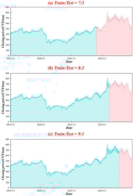 China is the largest importer and second-largest consumer of crude oil in the world [28]. Because of its limited domestic reserves, the country has maintained a high level of oil dependence. The Chinese crude oil futures market started relatively late and did not officially launch its first contracts until 26 March 2018. Hence, the market is still immature and quite sensitive to external forces, including global oil price fluctuations [29]. The INE crude oil futures is the first commodity futures contract available to foreign investors in mainland China and is critical to the expansion of the crude oil market. Thus, this study selected the daily closing price of the INE futures as the forecasting target and collected data from the WIND database. The sample period spans from 2 January 2019 to 3 January 2023 and includes 972 trading-day observations. This period encompasses several extreme and representative events, including the COVID-19 pandemic and the subsequent recovery phase. The high volatility and structural disruptions induced by these black swan events can be used to effectively assess the robustness and stability of the proposed model under conditions of uncertainty. Figure 5 depicts the closing price chart. It is obvious that the price movement is nonlinear, nonstationary, and highly volatile. As a consequence of the COVID-19 epidemic, prices declined sharply around the start of 2020. The original dataset was divided into training and test sets, with the first 70%, 80%, and 90% of INE crude oil futures prices used for model learning and training and the rest of the data reserved as test sets, as portrayed in Figure 5. The training sets are depicted in green, while test sets are represented in red. This design avoids information leakage and allows for robustness evaluation across different out-of-sample periods.