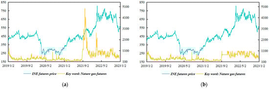 Due to the influence of unforeseen events, the web search volume for certain keywords often surges or plummets over short periods. Although extreme spikes can reflect public attention to some extent, such data are also full of noise and invalid information. To eliminate the interference of noisy data, we employed the isolation forest method, an efficient tree-based machine learning algorithm, to identify and remove outliers. Specifically, the algorithm constructs multiple decision trees based on randomly selected features to partition data [30]. We then applied the linear interpolation method to fill in the missing data. As shown in Figure 6, it is clear that the search volume for ‘natural gas futures’ peaks around September 2021. After reviewing relevant information, we believe that the abnormal volatility is caused by the global natural gas shortage and is less related to the crude oil market. It is obvious that the temporal patterns of crude oil futures prices and search engine data exhibit a high degree of consistency after anomaly detection, underscoring the necessity of data cleaning. Table 4 provides several data samples, including original crude oil futures prices and corresponding search engine data before and after anomaly detection.