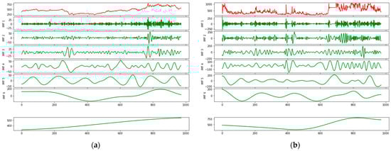 After data preprocessing, we applied the CEEMDAN algorithm to decompose historical INE prices and search engine data sequentially. It is evident from Figure 7 that there are six IMF components as well as one residual component. Moreover, each IMF component is arranged from high to low frequency. IMF1, the highest-frequency component, fluctuates violently and represents noisy data contained in the initial signal. As the frequency gradually decreases, the sequence fluctuation tends to be regular, reflecting the periodic trends of the original data. The residual term, in contrast, illustrates an approximate linear upward trend, consistent with the long-term trend. The results of the CEEMDAN decomposition are presented in Figure 7. The original dataset is depicted in red, whereas the decomposed IMF components are displayed in green.