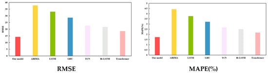 We compared the proposed model with several common single models, which encompass the ARIMA, Temporal Convolutional Network (TCN), GRU, LSTM, Bi-LSTM, and Transformer models. The hyperparameters of the ARIMA (p, d, q) model comprise the autoregressive order (p), moving average order (q), and difference order (d). Specifically, d, p, and q are all set to 1. TCN is an improved type of classical CNN model, which usually consists of multiple residual units. Each residual unit mainly encompasses dilated and causal convolution layers. GRU simplifies the architecture of LSTM by merging the input and forget gates into one single update gate. Prior research confirm that although LSTM outperforms GRU in terms of forecasting accuracy, GRU requires less training time [34]. Bi-LSTM consists of forward and backward LSTM layers and can learn both historical and future information. Transformer was proposed by the Google team in 2017 [35]. Owing to its outstanding performance in processing sequential data, recent studies have investigated its application in time series forecasting. Table 7 displays the final prediction results, while Figure 9 uses bar and line graphs to visualize the prediction results under the train–test split ratio of 7:3.