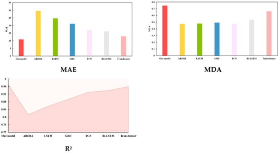 where and denote the predicted and actual values, respectively. The MAE, MAPE, and RMSE measure the deviation between the predicted and actual values, while the MDA and R2 represent the degree of alignment between the predicted and true values.