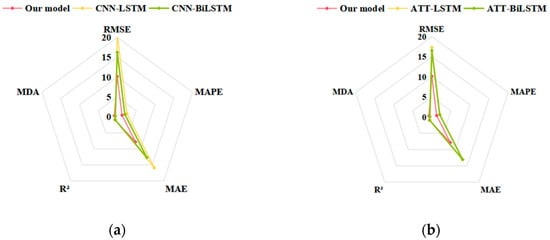 In view of the limited representation ability, it is difficult for single forecasting models to fully capture the inherent data features. Our study further selected several hybrid models as baseline models, namely, CNN-LSTM, CNN-BiLSTM, and LSTM embedded with an attention mechanism (ATT-LSTM), and Bi-LSTM embedded with an attention mechanism (ATT-BiLSTM). The aforementioned four models add a convolutional layer or attention mechanism to the corresponding single models to enhance the feature extraction capability. Table 8 presents the final prediction results. It is evident from Table 8 that all the hybrid models outperformed the corresponding single models in Table 6, thereby verifying the superiority of the CNN and Attention Mechanism modules in feature extraction and sequence modeling. In addition, the hybrid model with Bi-LSTM performed much better than its LSTM counterpart in the same position. This finding reinforces the superiority of Bi-LSTM.