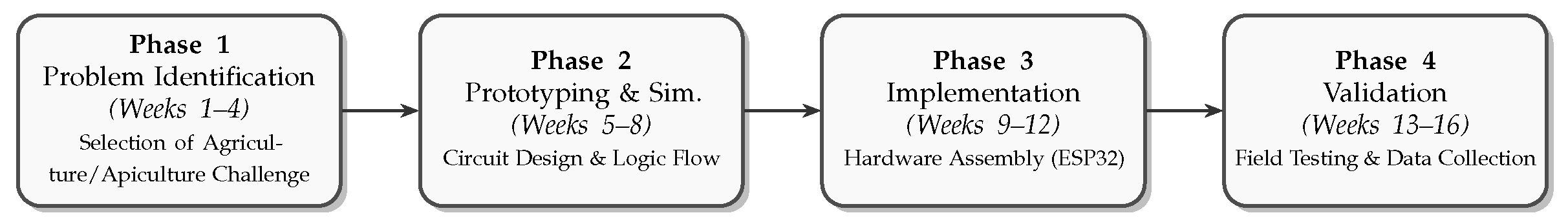 The intervention was embedded in regular semester coursework (16 weeks) and followed the official syllabus for each NRC. The weekly workload comprised 4 contact hours (lectures and guided laboratory sessions) and an estimated 8 h of autonomous teamwork devoted to prototyping, debugging, and dashboard configuration. Student teams were formed with 3–4 members and worked on a single ESP32-based solution from problem framing to field validation.