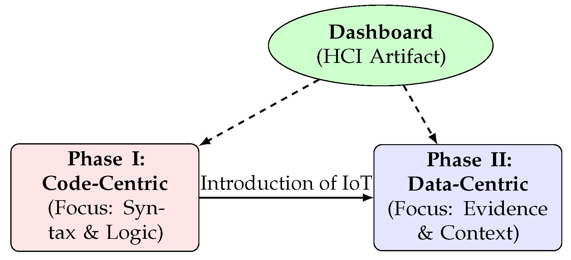 Cognitive shift enabled by the full-stack IoT architecture. Solid arrows indicate the transition between instructional phases, from a code-centric focus to a data-centric reasoning approach following the introduction of IoT technologies. Dashed arrows represent the mediating role of the dashboard as an HCI artefact, influencing students’ cognitive processes across both phases by supporting reflection, interpretation, and iterative reasoning based on real-time data.