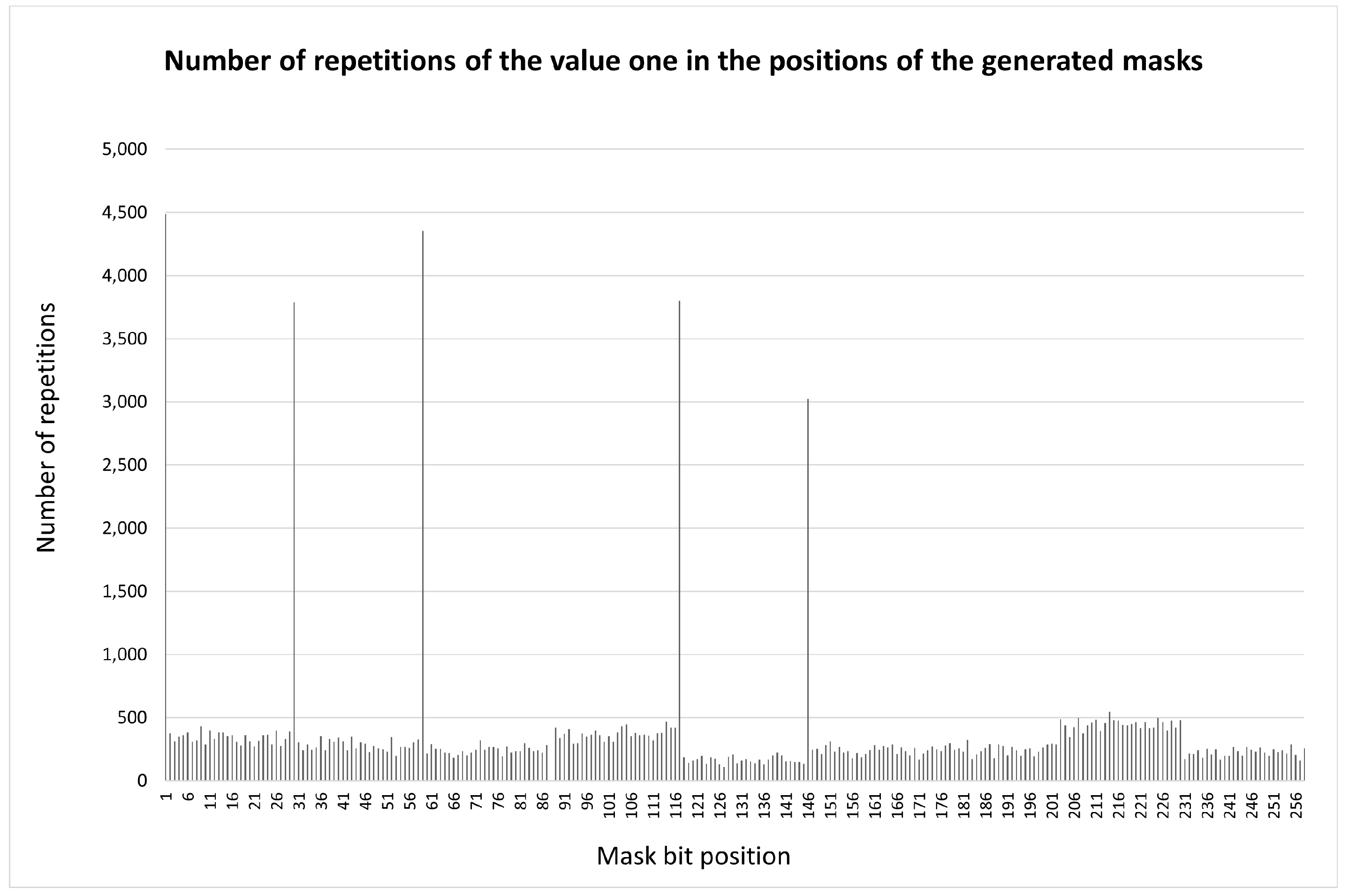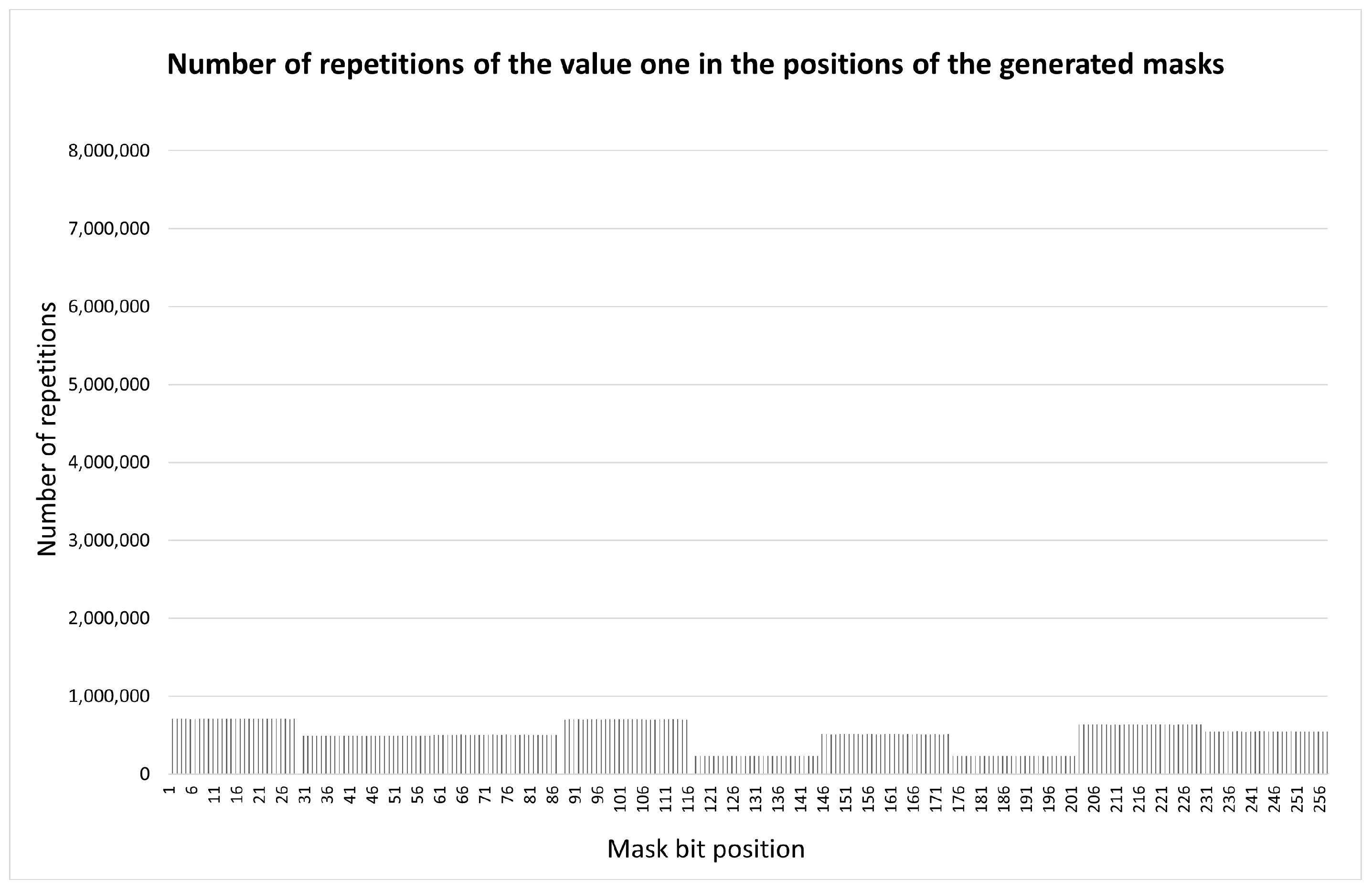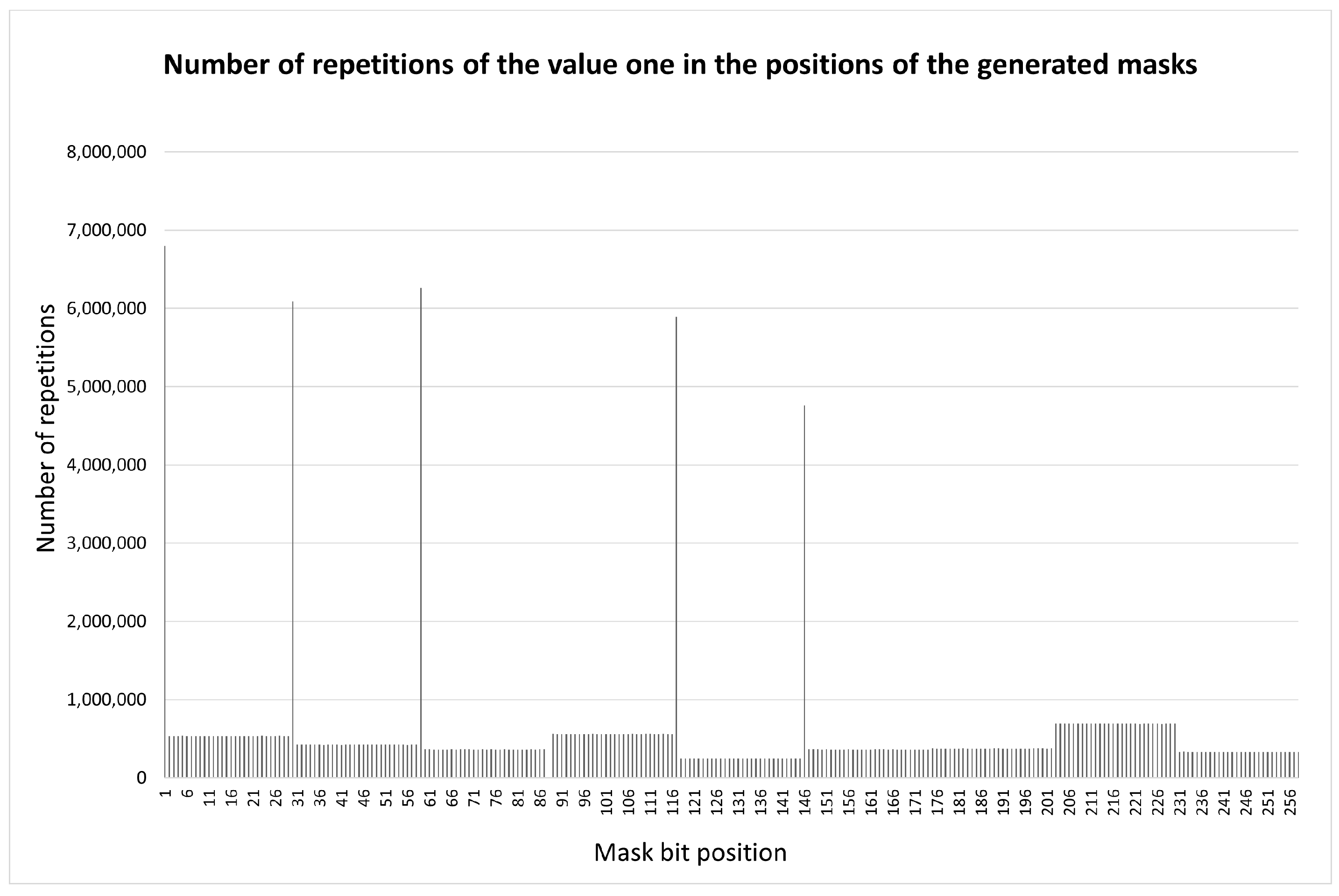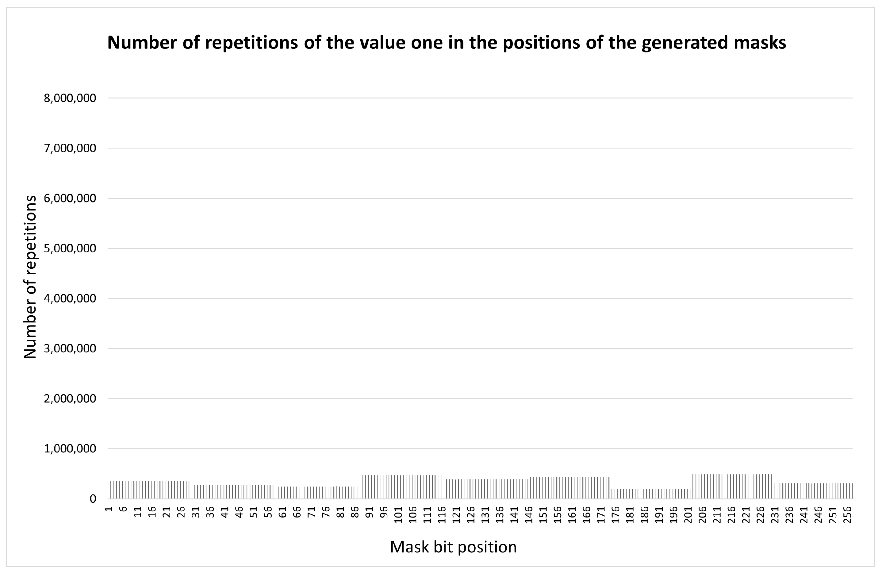 M values. We suppose that the main issue is the need to eliminate spikes in the distribution function of unmasked bits along the container length. Such spikes make it easier for an adversary to distort the transmitted message using intentional network noise. To obtain a uniform distribution function of inclusions along the length of the container in [