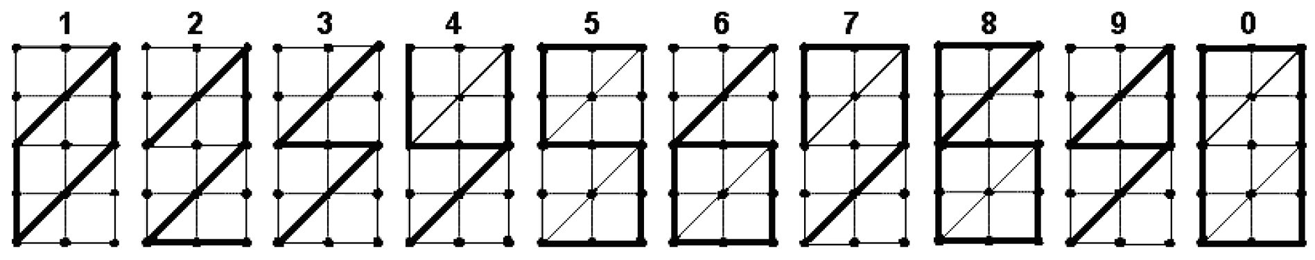 Binary matrix-etalon: A binary matrix of size , where , that encodes the graphical representation of a single digit from the set . The positions of ones in this matrix define the shape (configuration) of the digit. The term “etalon” (from French étalon, meaning “reference standard”) denotes a reference pattern against which incoming data is matched during recognition.