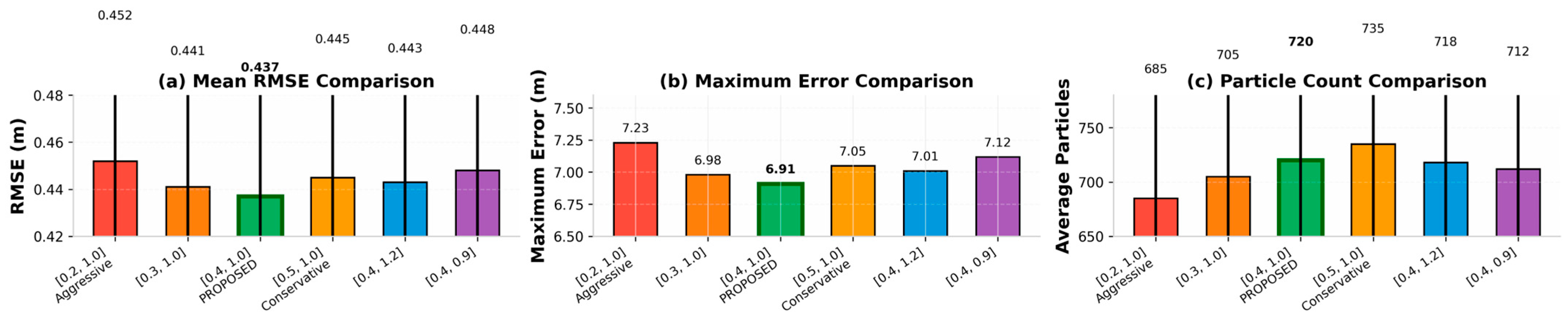 Figure 2 that the proposed range [0.4, 1.0] delivers the optimal performance across all evaluated metrics. Specifically, this range achieves the lowest average RMSE (0.437 m) and maximum error (6.91 m), while maintaining a moderate particle count (720 particles). In contrast, overly aggressive penalty ranges (e.g., [0.2, 1.0] and [0.3, 1.0]) result in increased RMSE and larger fluctuations in particle number, whereas overly conservative ranges (e.g., [0.5, 1.0]) fail to adequately suppress inconsistent particles. Variations in the upper bound ([0.4, 1.2] and [0.4, 0.9]) show limited impact on performance, indicating that the primary function of the neural network is penalty rather than reward.
