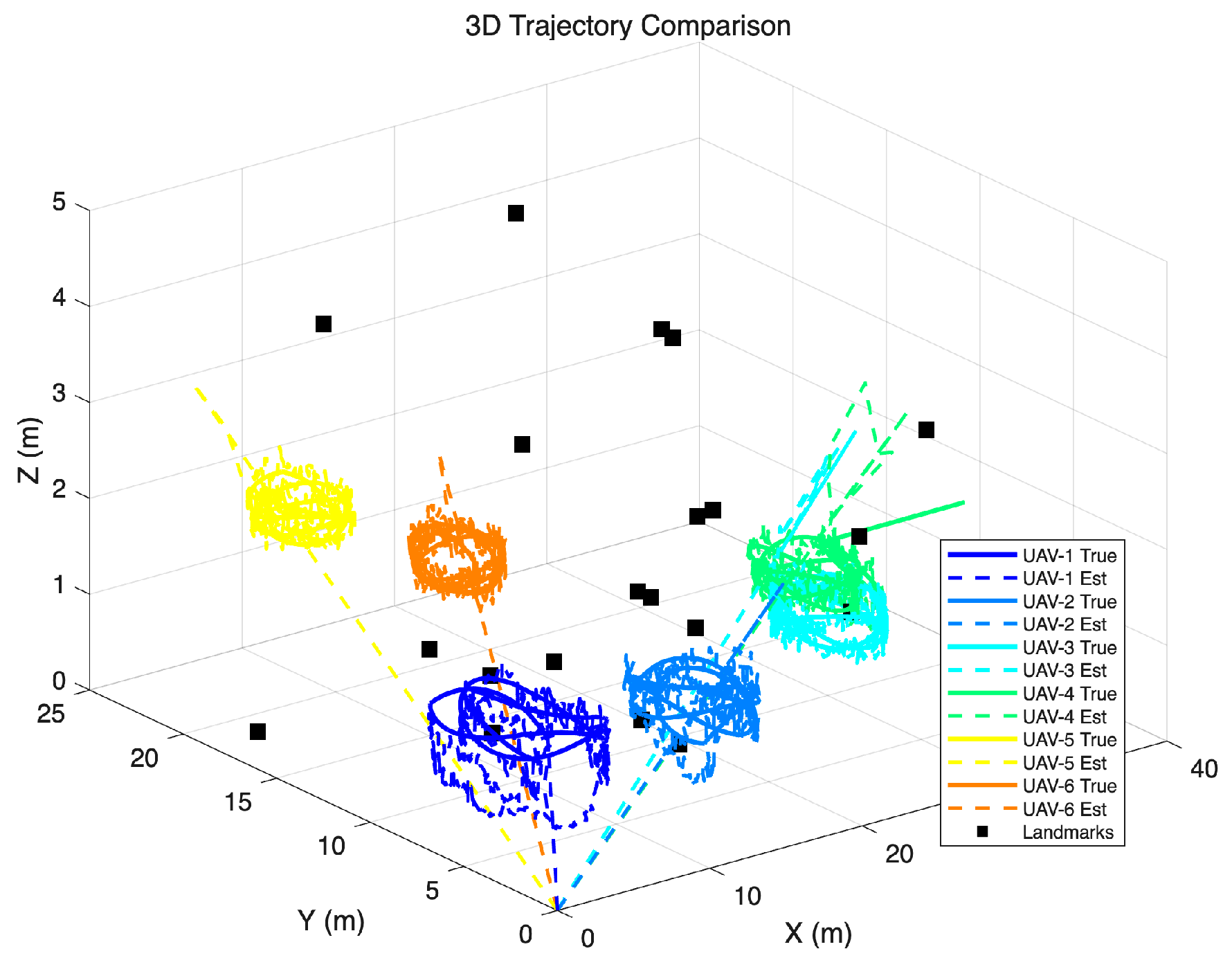 The estimated trajectories closely follow the ground truth trajectories for all six UAVs throughout the one-hundred-second simulation, demonstrating the algorithm’s capability to maintain accurate localization. The overlapping nature of true and estimated paths indicates sub-meter tracking accuracy. The six UAVs follow circular trajectories with phase offsets of sixty degrees, creating a hexagonal formation pattern that ensures adequate separation while maintaining UWB communication range. The black squares represent the twenty environmental landmarks randomly distributed throughout the space. The trajectories demonstrate that UAVs traverse regions with varying landmark densities, testing the algorithm’s robustness under different observability conditions. UAVs flying through landmark-sparse regions must rely more heavily on UWB inter-vehicle measurements for localization. The z-axis variation from approximately 1.2 m to 1.8 m reflects the sinusoidal vertical motion component added to each UAV’s trajectory, testing the algorithm’s ability to track three-dimensional position.