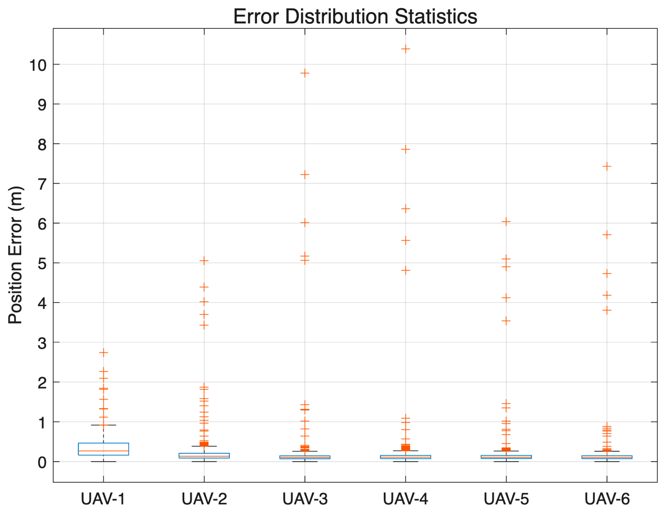 Figure 6, further highlight the system’s consistency. The median errors for all UAVs remain below 0.2 m, indicating that fifty percent of all time steps achieve errors below this threshold. This demonstrates consistent performance across the majority of the simulation.