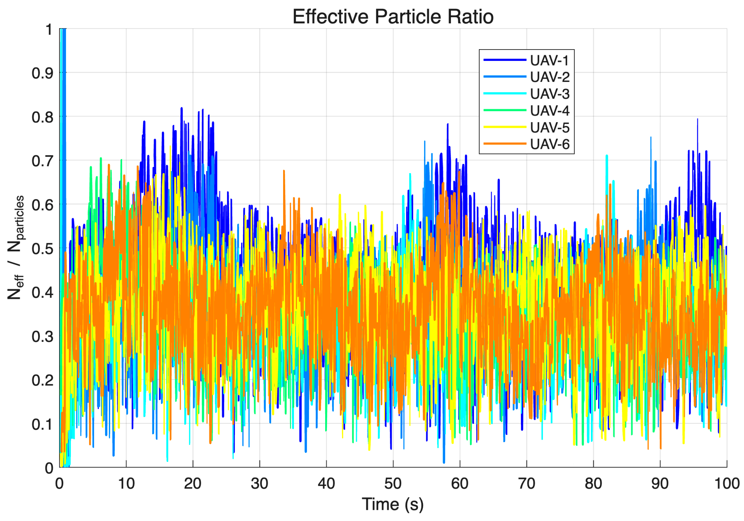 Figure 8 presents the effective particle ratio over time, providing insights into particle filter health. The effective particle ratios fluctuate predominantly in the 0.3 to 0.6 range, with occasional excursions below 0.2 and above 0.8. This distribution indicates moderate particle degeneracy that is actively managed through the resampling mechanism. Most UAVs experience resampling events every ten to thirty time steps, with UAV-1 and UAV-4 showing more frequent resampling due to their higher error variability.