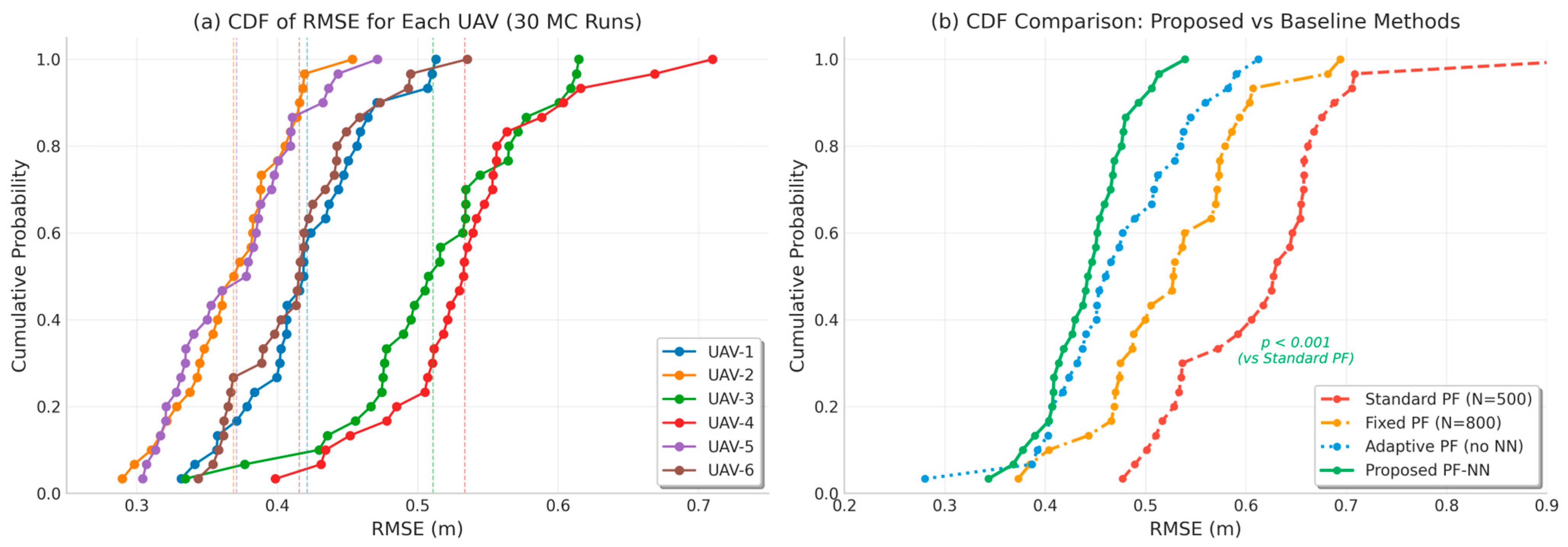 The comparison with external state-of-the-art algorithms provides additional context for assessing the computational characteristics of PF-NN. The EKF Cooperative method achieves the lowest computational cost (18.5 ± 2.3 ms/step) and memory footprint (65 MB) due to its reliance on Gaussian assumptions and efficient matrix operations. However, the linearization errors inherent in EKF may limit its applicability in highly nonlinear scenarios.