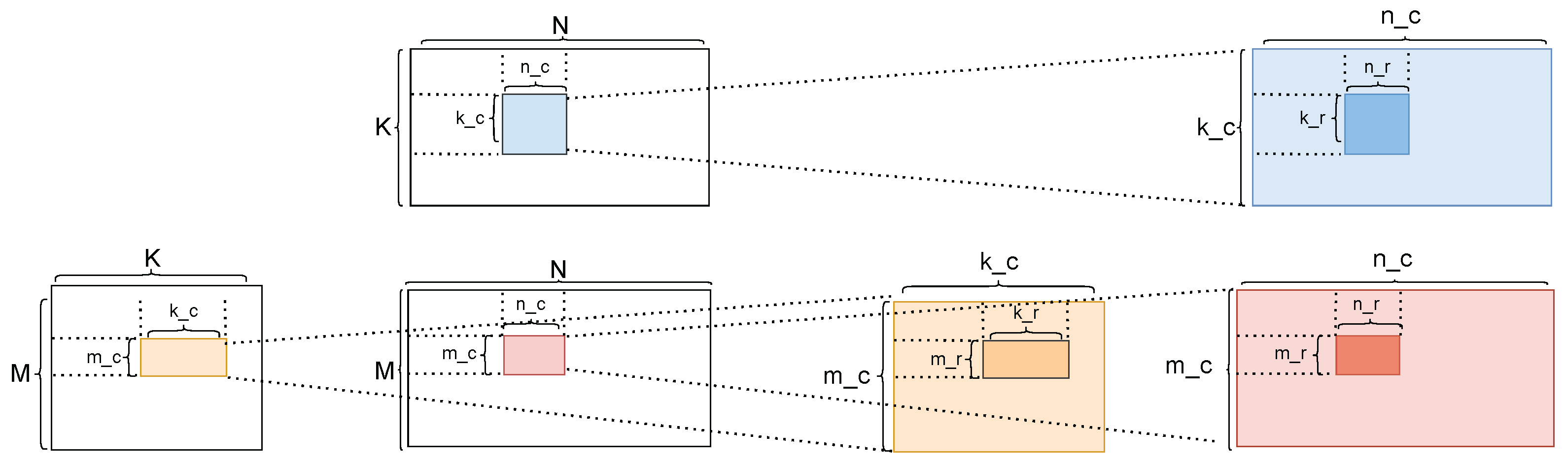 In matrix multiplication , blocking (or tiling) is a fundamental optimization technique to fully utilize registers and multi-level caches. Given the matrix dimensions M, N, and K, block sizes , , and are chosen according to the hardware characteristics, ensuring that each block can reside in registers or high-speed cache for multiple reuse, thus reducing memory traffic.
