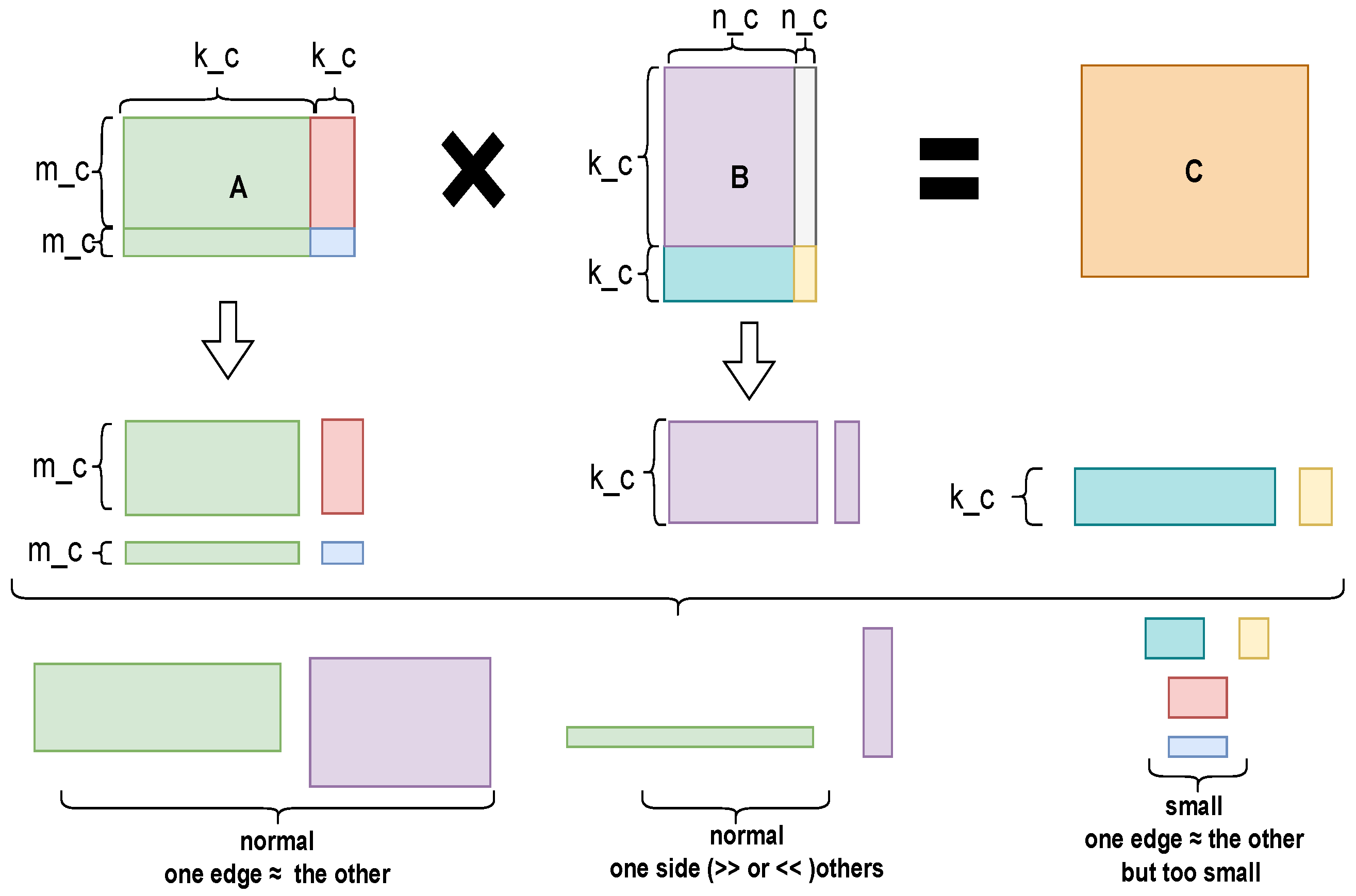 , respectively. Second, in GEMM and other matrix multiplication operations, matrices are typically blocked into fixed sizes (e.g.,