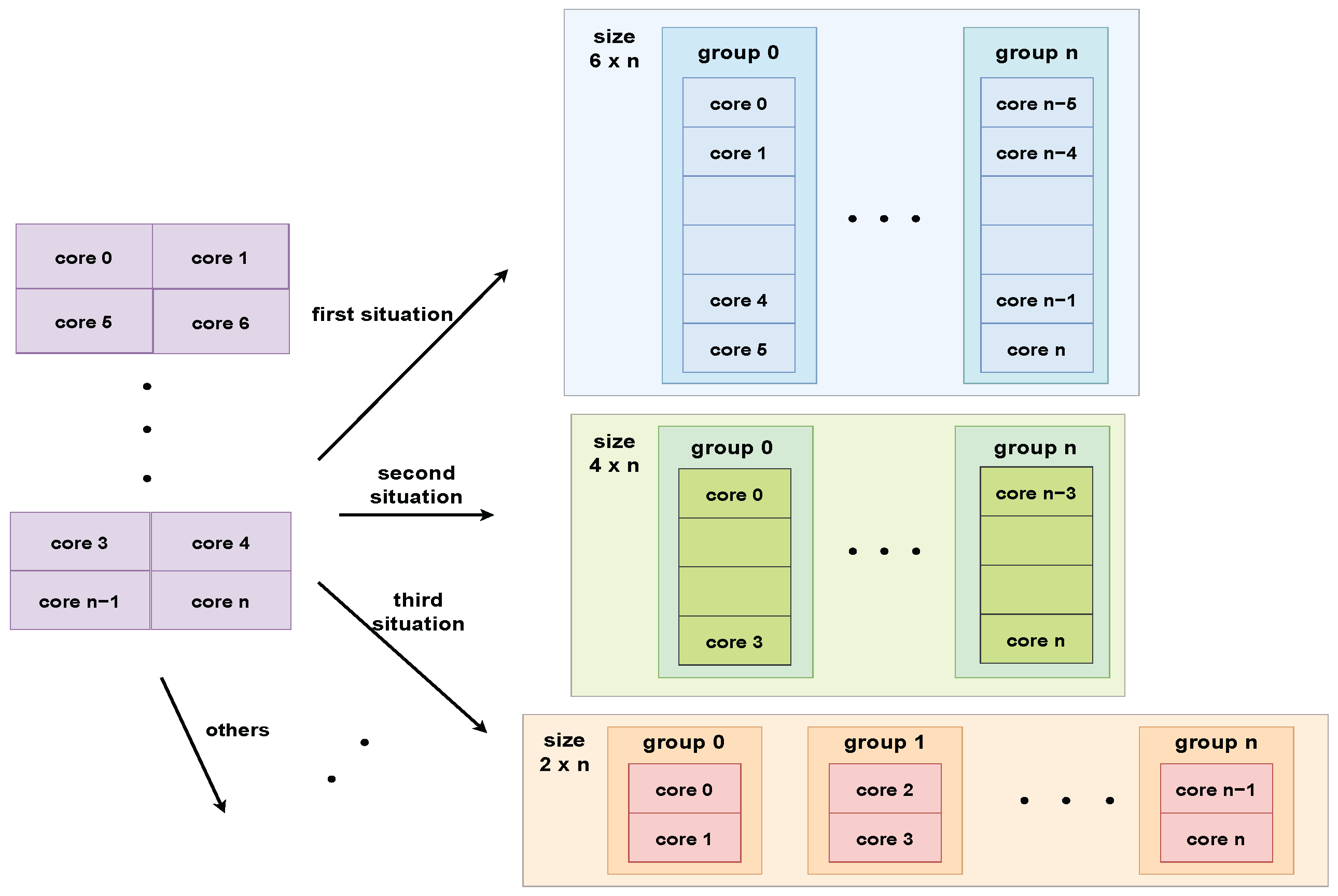 To further refine the grouping approach, during initialization, the system determines the optimal core grouping level based on the matrix size, workload granularity, and the number of available threads. Let