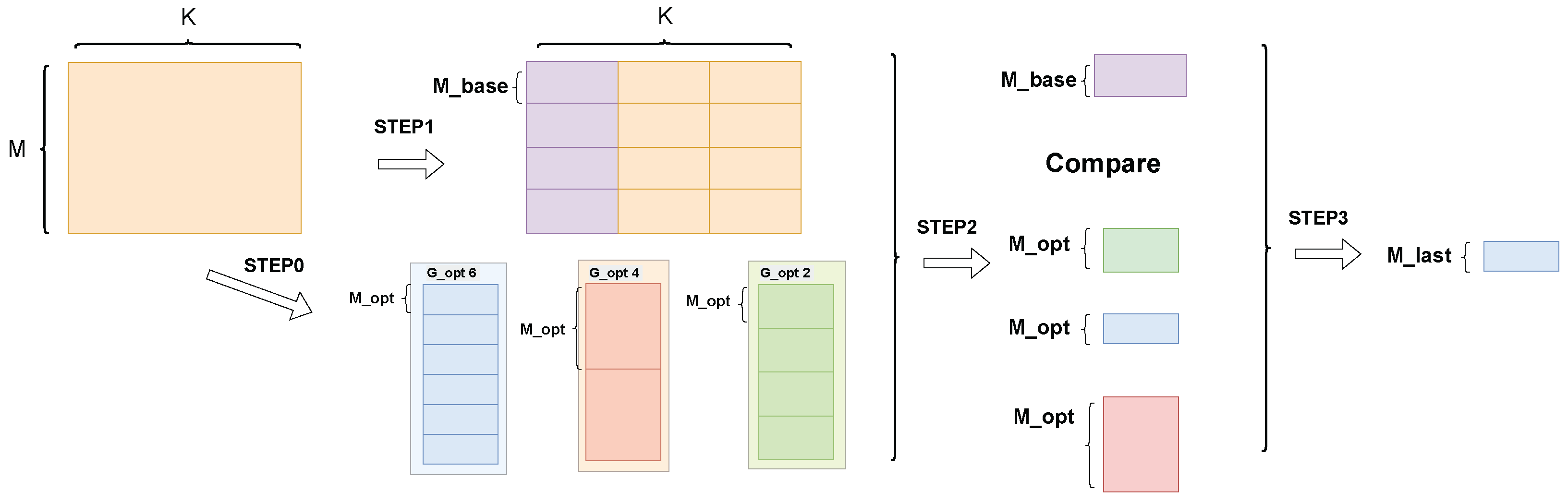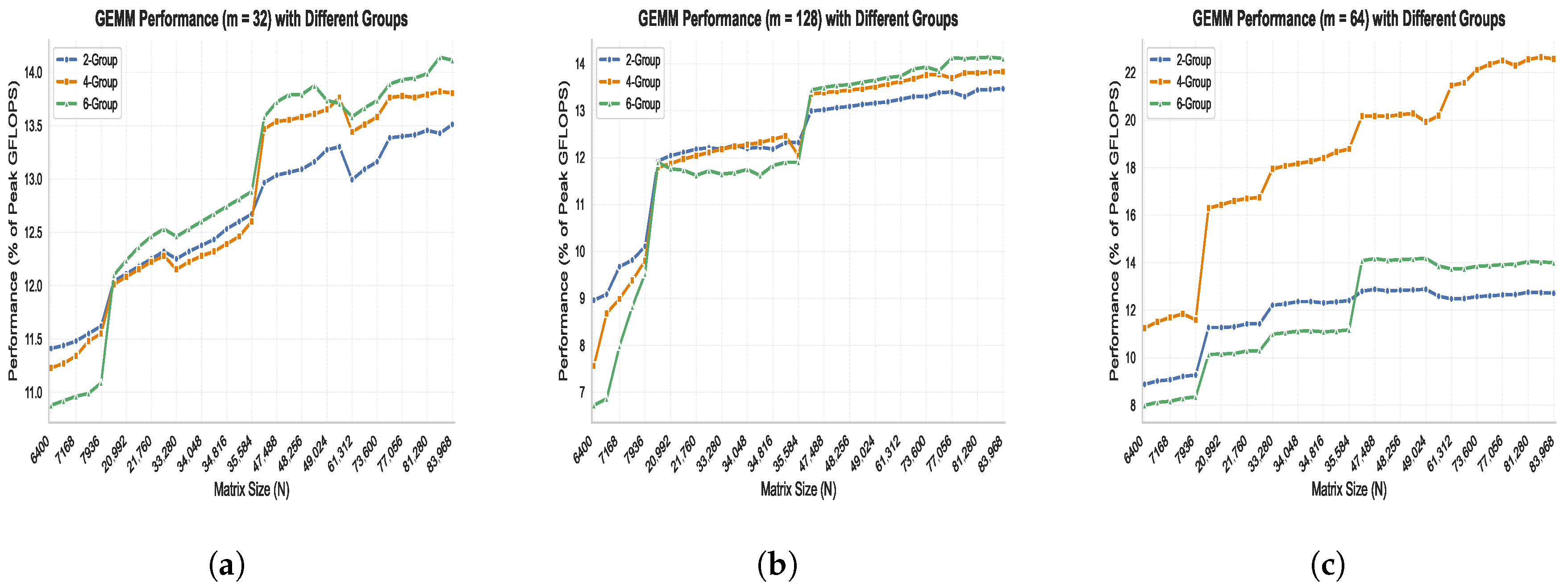 In practice, the selection of is not solely determined by Equation (3), but also influenced by matrix dimensions and hardware characteristics.