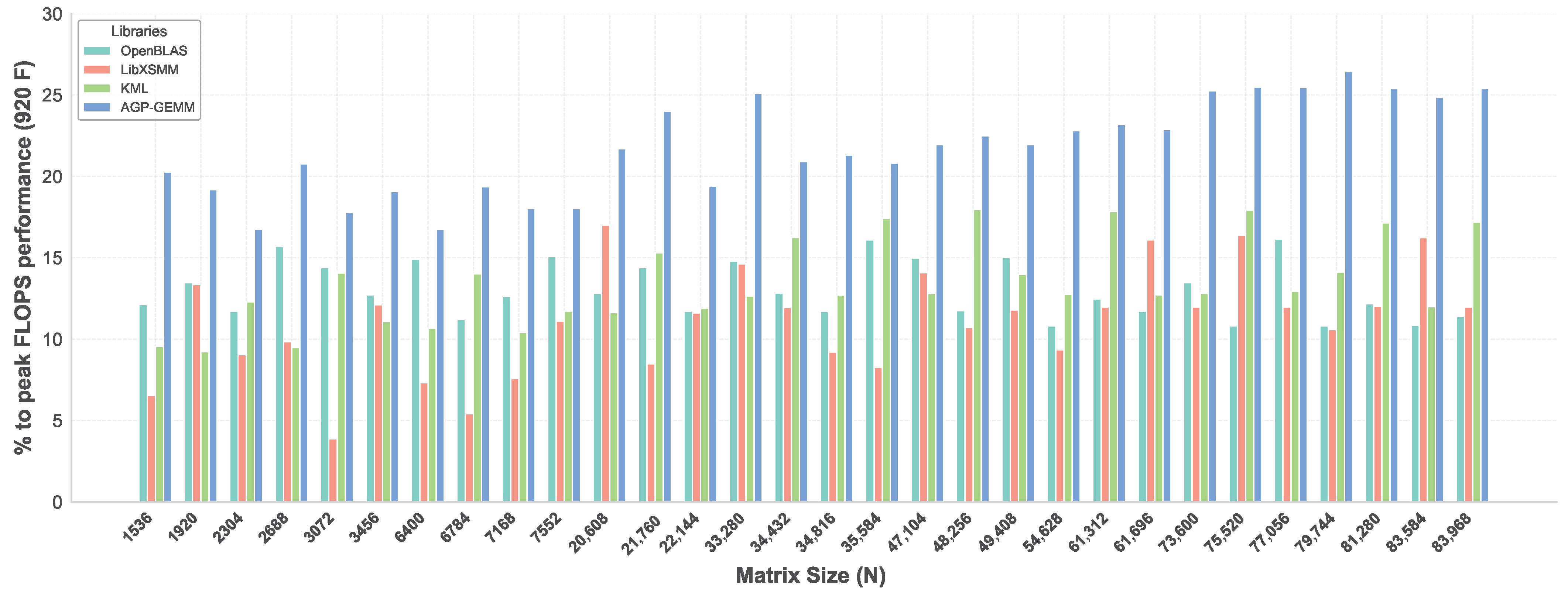 N increases. AGP-GEMM consistently achieves the highest performance, providing up to 2.3× speedup over the best-performing baseline. Across the tested matrices, AGP-GEMM achieves 1.5–2.5× speedup over OpenBLAS and 1.6–2.1× over KML, while consistently outperforming LIBXSMM. For instance, at moderate matrix sizes (e.g.,