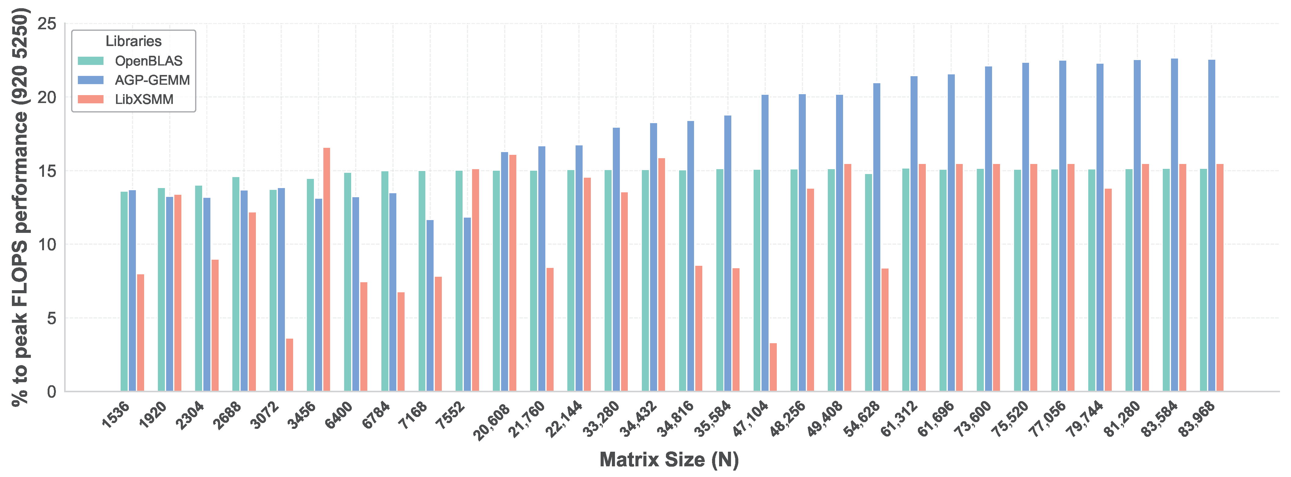 To better understand this trend, we observe that as N increases, the available parallelism across core groups becomes fully exploited. Once all groups are actively engaged, further increases in N only enlarge the workload per group rather than increasing parallelism. As a result, performance gradually approaches a saturation point. In this regime, execution becomes bounded by hardware constraints such as peak compute throughput and memory bandwidth, rather than the efficiency of individual libraries. This behavior is consistently observed across both the 920F and 920 5250 platforms.
