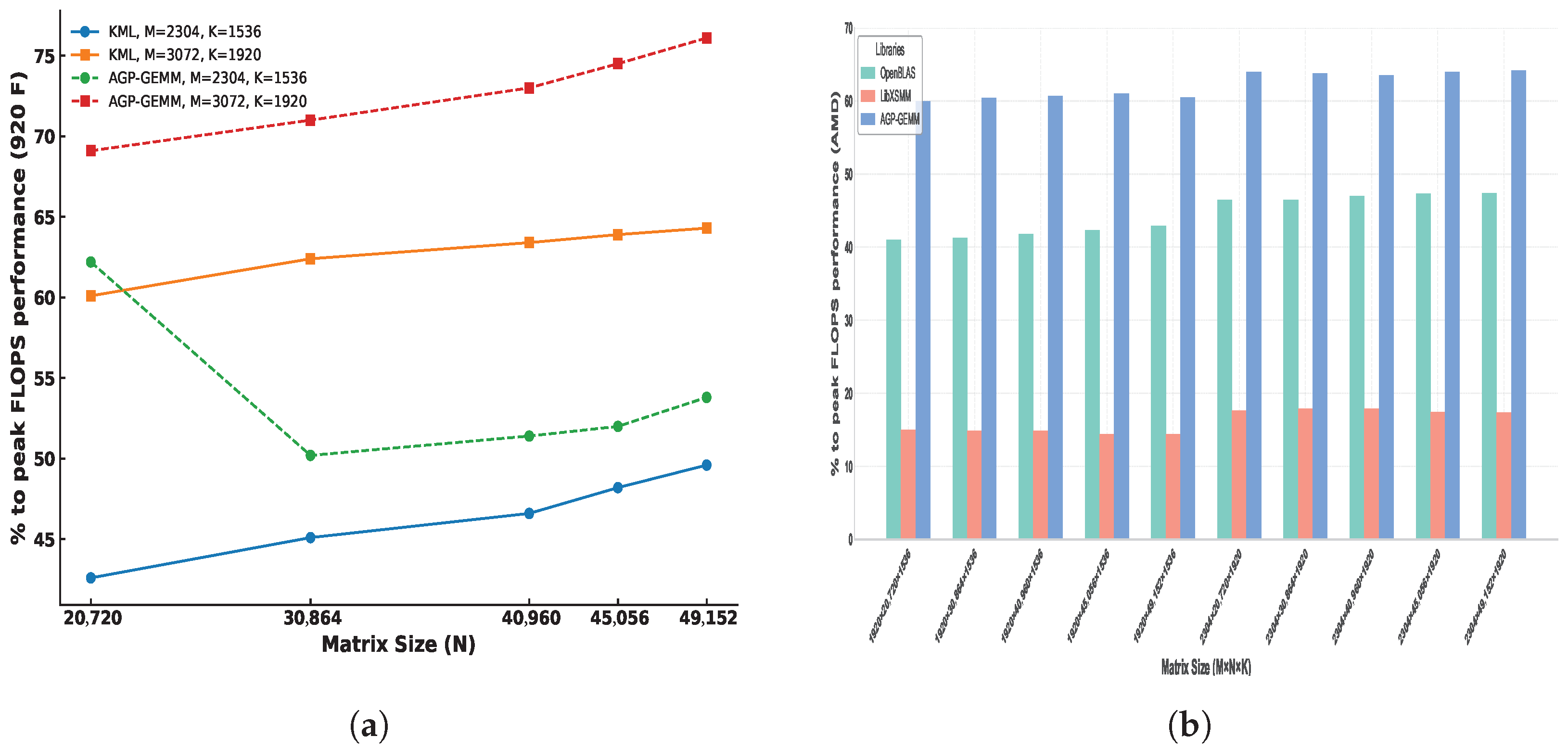 Figure 7b presents the relative performance of OpenBLAS, Libxsmm, and AGP-GEMM on the AMD platform as
