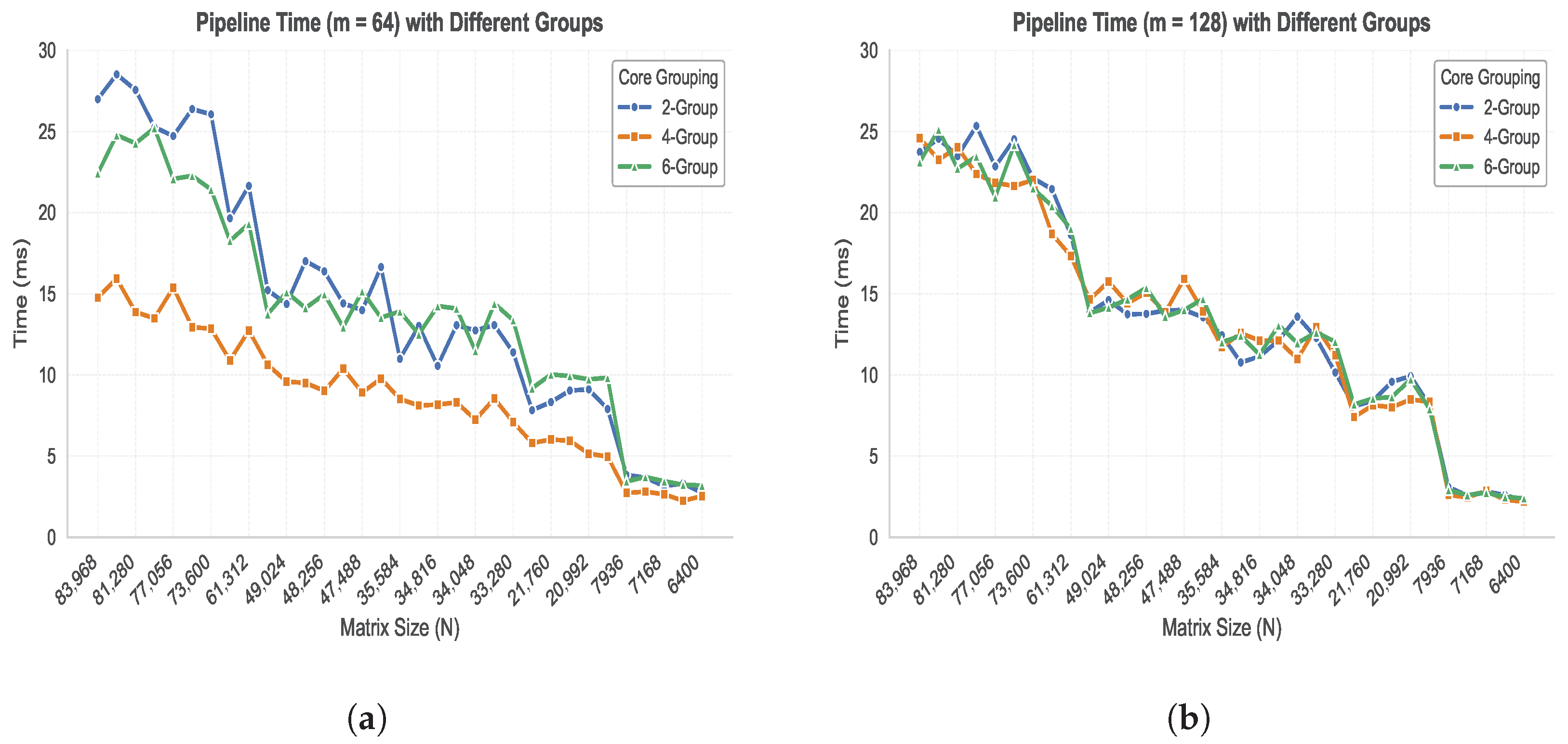 In contrast, the four-core grouping demonstrates the most stable performance across all matrix sizes, achieving 2.5 ms to 2.8 ms for small N, 5 ms to 10 ms for medium N, and 13 ms to 16 ms for large N. This stability reflects effective overlap between computation and memory access. The six-core grouping slightly outperforms the two-core scheme in certain cases; however, it exhibits significant fluctuations as N increases (12 ms to 25 ms), mainly due to increased thread synchronization overhead and cache contention. Overall, the four-core grouping achieves the best balance among parallel depth, cache sharing, and thread coordination, thereby maximizing pipeline utilization and overall throughput.