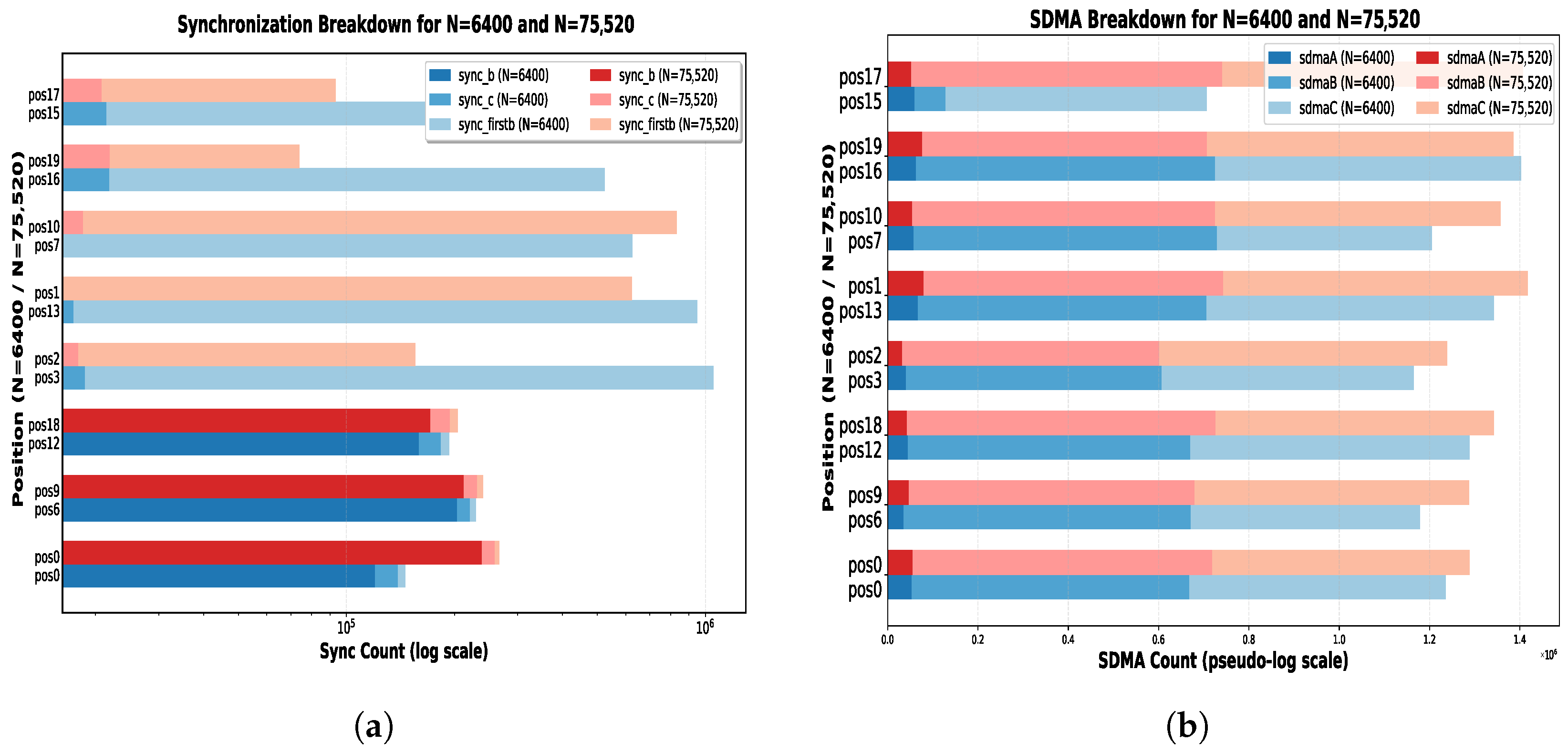 Figure 10 presents the synchronization and SDMA data transfer overheads across different thread positions for matrix sizes