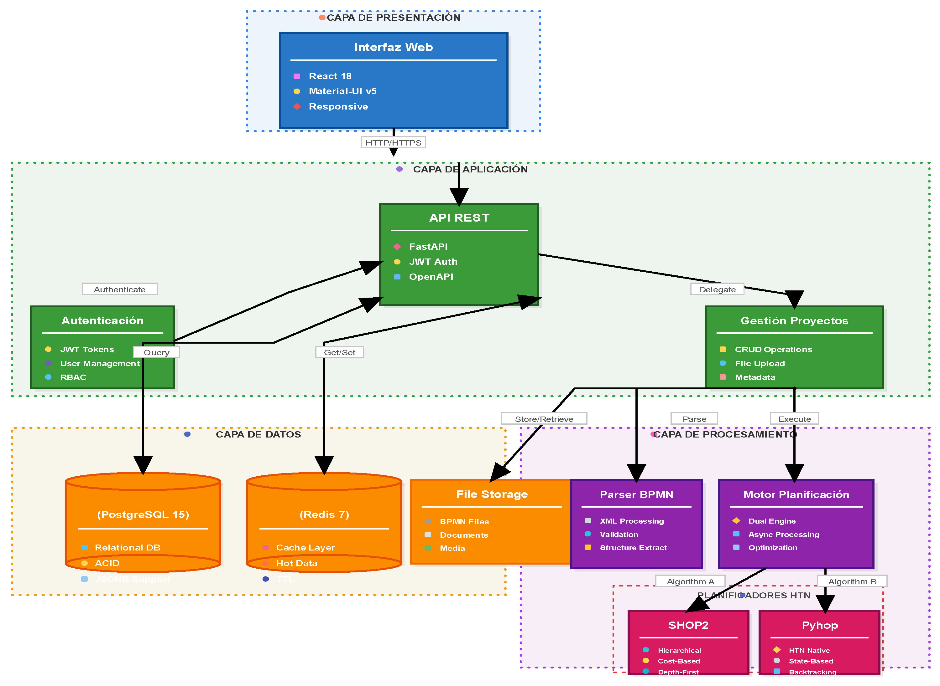 Figure 2 summarizes the layered software architecture of PlanProjU and highlights the end-to-end workflow that transforms BPMN-based university project models into executable HTN planning artifacts. The architecture is organized into four main layers: the presentation layer, the application layer, the processing layer, and the planning layer. At the presentation layer, users interact with the platform through a web-based interface that supports project registration, BPMN upload, plan visualization, and result inspection. The application layer exposes the core services through a REST API implemented with FastAPI, while authentication and authorization are handled through JWT-based access control and role-based permissions. The processing layer is responsible for BPMN parsing, semantic extraction, graph construction, and transformation into HDDL domain and problem files. Finally, the planning layer executes the generated representations with HTN planners and returns the resulting plans and comparative metrics to the user interface. This layered design supports modularity, traceability, and extensibility within the platform. The project management component orchestrates CRUD operations, file uploads, and metadata handling, delegating persistence responsibilities to the data layer, were PostgreSQL supports transactional storage (ACID) and JSONB structures, Redis provides coaching for hot data and TTL-based performance optimization, and file storage maintains BPMN files and associated documentation. Finally, the processing layer operationalizes the core research contribution: a BPMN parser performs XML processing, structural validation, and model feature extraction, feeding a planning engine that executes planning requests using alternative algorithms (SHOP2 and PyHOP) to produce comparable plan variants.