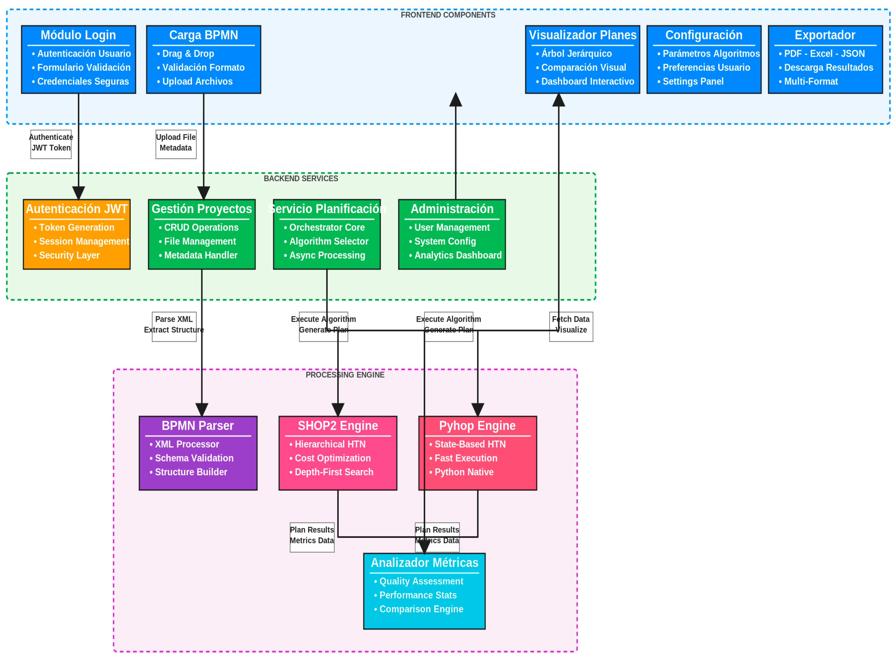 Within the processing engine, the BPMN parser performs XML parsing, schema validation, and structural extraction, producing the planning-ready representation that is then executed by two alternative planners SHOP2 (hierarchical HTN, depth-first search, cost optimization) and a PyHOP-based engine (state-based HTN execution). Plan outputs and runtime metrics are consolidated by a dedicated Metrics Analyzer that supports quality assessment, performance statistics, and comparative evaluation, and the resulting data is fed back to the frontend for visualization and decision support. This component is central to the practical contribution of PlanProjU, as it enables users to inspect alternative execution plans generated from the same BPMN model and to use comparative evidence when selecting an implementation strategy. Overall, architecture evidences a modular design that makes the planning subsystem, metric evaluation, and UI-layer comparison tightly integrated but independently evolve an important property for replicable experimentation and iterative enhancement in a research-grade planning platform.