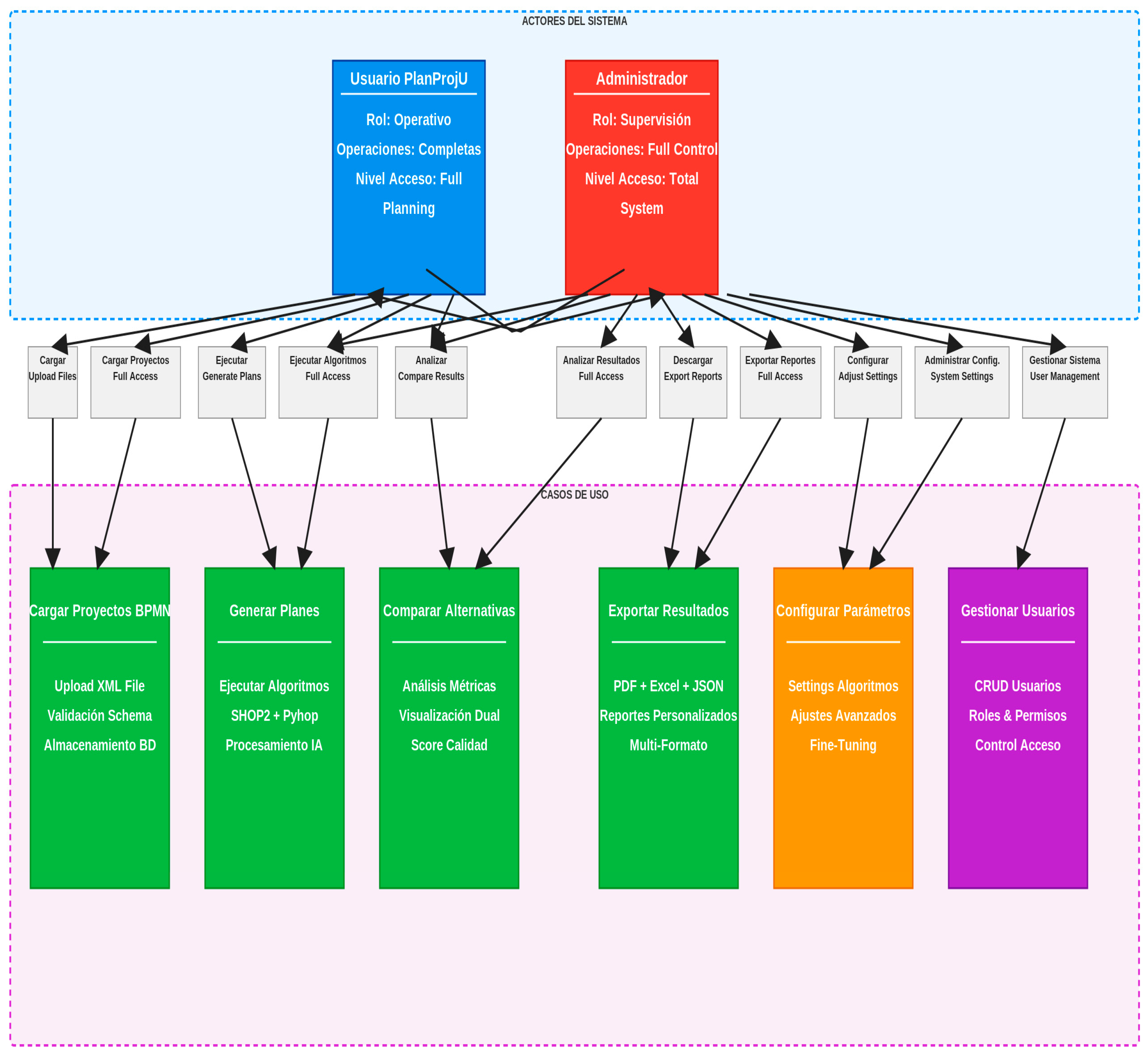 Figure 4 illustrates the internal workflow used by PlanProjU to parse BPMN models and transform them into planning representations. The figure shows how the uploaded BPMN/XML file is processed to identify relevant structural elements, construct an intermediate graph representation, and extract the dependencies required for hierarchical planning. These elements are then used to generate the corresponding HDDL domain and problem files, which are later executed by the selected HTN planner. This transformation workflow is central to the contribution of the paper because it operationalizes project knowledge encoded in BPMN into executable planning artifacts while preserving the supported structural relations of the original process model. The workflow is complemented by Export Results, enabling multi-format reporting (PDF/Excel/JSON) and customizable report generation, which supports traceability and offline review. In parallel, the platform exposes governance-oriented functions Configure Parameters (algorithm settings, advanced adjustments, and fine-tuning) and Manage Users (CRUD operations, roles/permissions, and access control) which are primarily aligned with the administrator’s responsibilities but may be visible depending on privilege assignment. Overall, the diagram demonstrates a clear separation of concerns between operational execution and system administration, while ensuring that the full planning lifecycle from BPMN ingestion to plan evaluation and reporting is supported under a coherent role-based access control (RBAC) scheme. An additional SHOP2-only export was also generated for the UTP case under a different parameter configuration. Since this auxiliary run was not paired with an equivalent PyHOP execution under the same conditions, it was not included in the main comparative analysis and is treated as supplementary evidence only.
