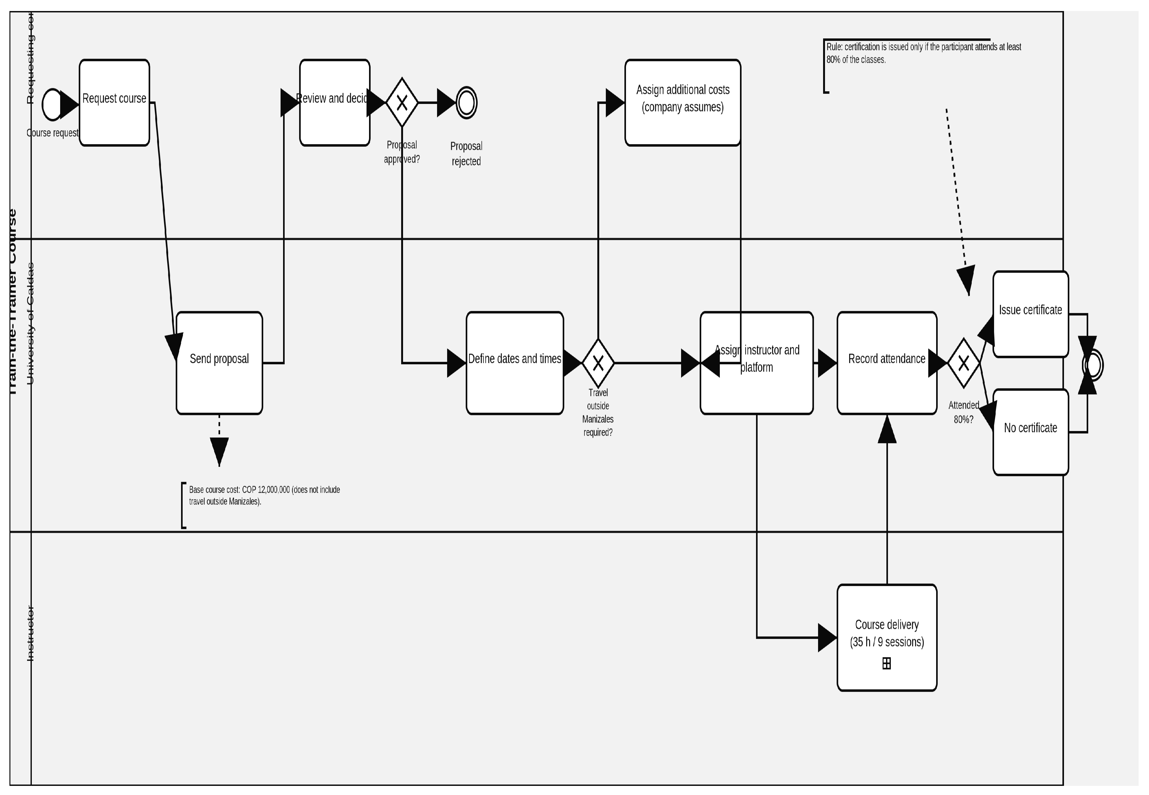 Figure 5 represents a BPMN model of the Audifarma-UNAL Train-the-Trainer extension project, structured by pools/lanes that define responsibilities (requestor, course coordination/management, and teaching/delivery role). The flow begins with the course request and the preparation/submission of the proposal, followed by a review and decision activity supported by a dedicated gateway, which branches the process toward approval or closure due to rejection. In case of approval, the model incorporates planning activities such as defining dates and resource allocation, as well as a gateway that specifies logistical and/or cost conditions, articulated with the rule that additional costs are assumed by the company. Then, the delivery of the course (3 h per session and 5 sessions) is connected to the attendance record, which acts as compliance control: a final gateway applies the certification policy, were a certificate is only issued if the participant attends at least 80% of the classes; Otherwise, it leads to the event of non-certification. Overall, the diagram demonstrates a process with explicit decision points, cost traceability, and a verification mechanism (attendance) that ensures consistency between the provision of the training service and the institutional certification criteria.