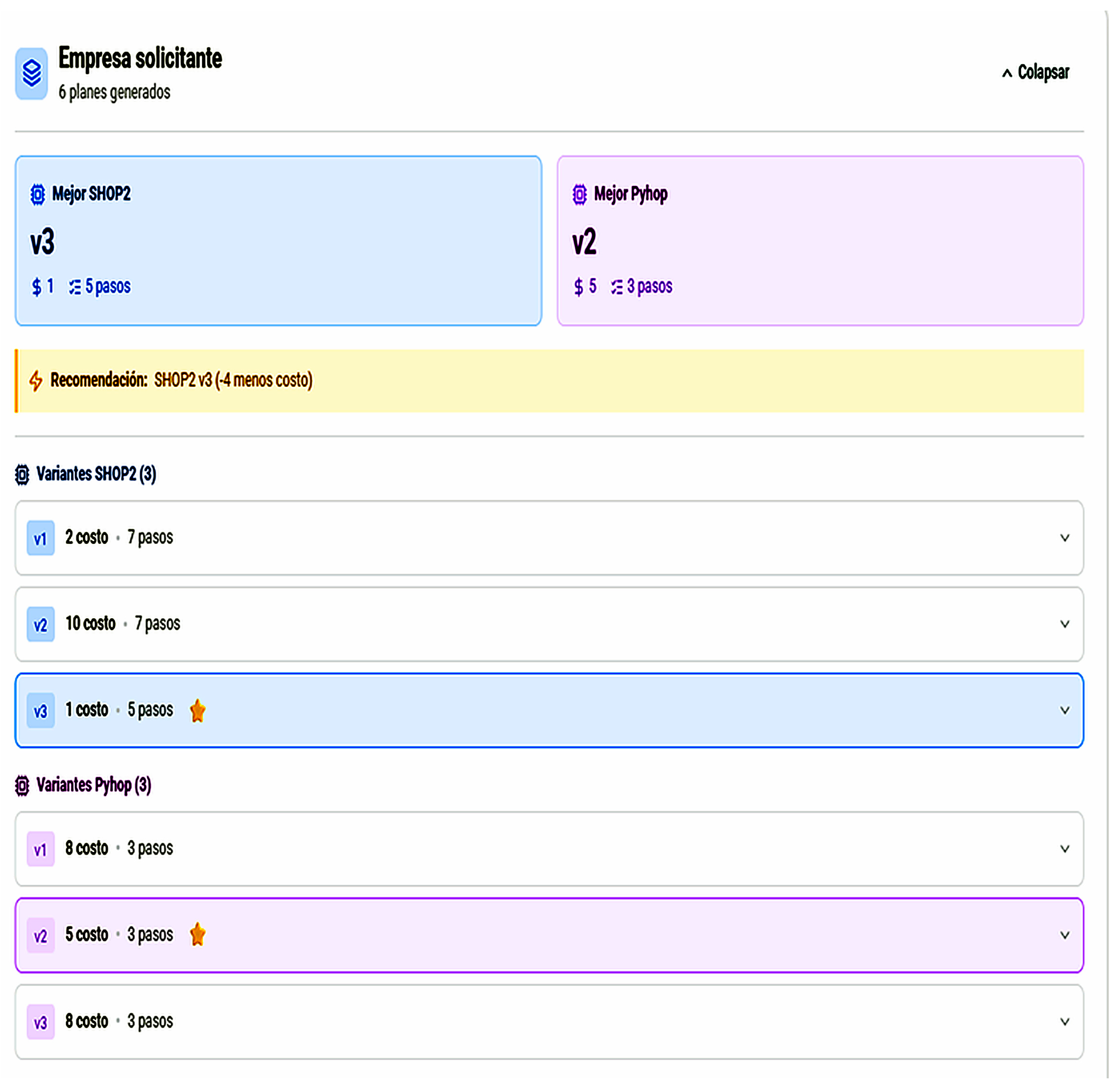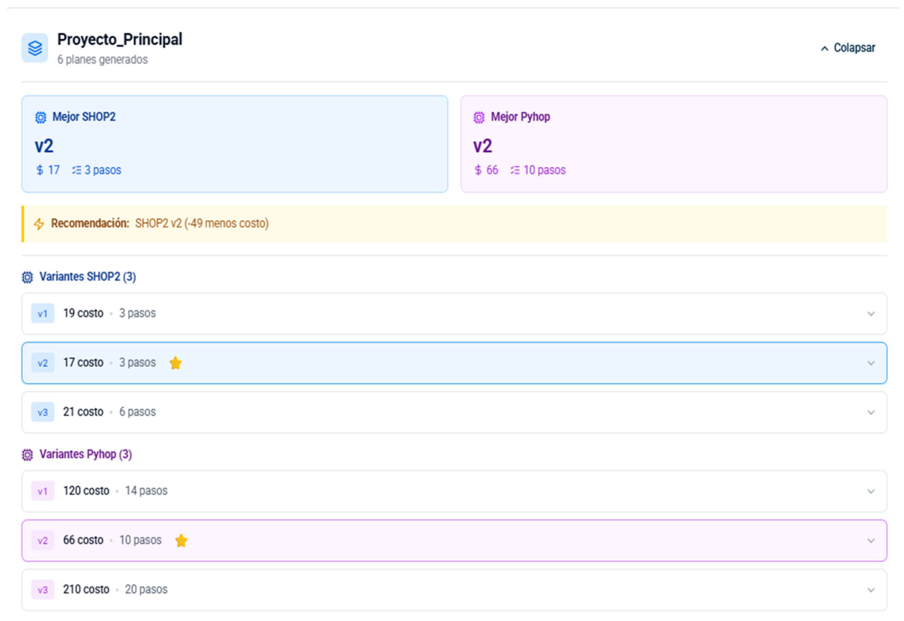 Analyzing the National University of Colombia block reveals a clear trade-off between economic efficiency and plan length: SHOP2 is selected as the best in its family with a cost of 6 and 7 steps, while PyHOP v3 has a cost of 7 with 4 steps. Consequently, the platform recommends SHOP2 because it is one unit cheaper, even though the plan is longer. This behavior suggests that, for this project, the search process penalizes certain decisions more significantly than simply reducing the number of activities. In terms of interpretation, PyHOP seems to produce plans with fewer steps but a higher overall cost; SHOP2, on the other hand, achieves preferable solutions, which is consistent with scenarios were breaking down activities further allows for choosing less expensive alternatives.