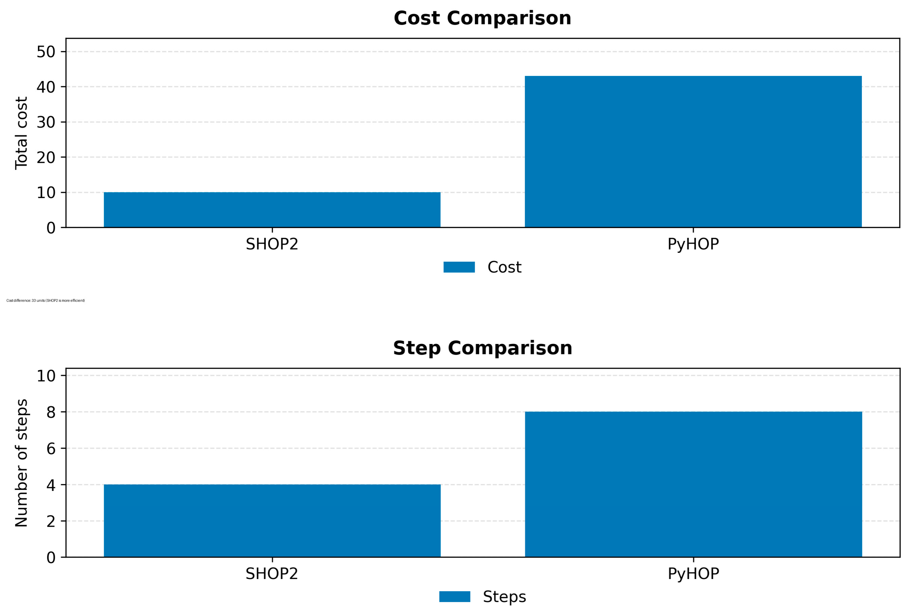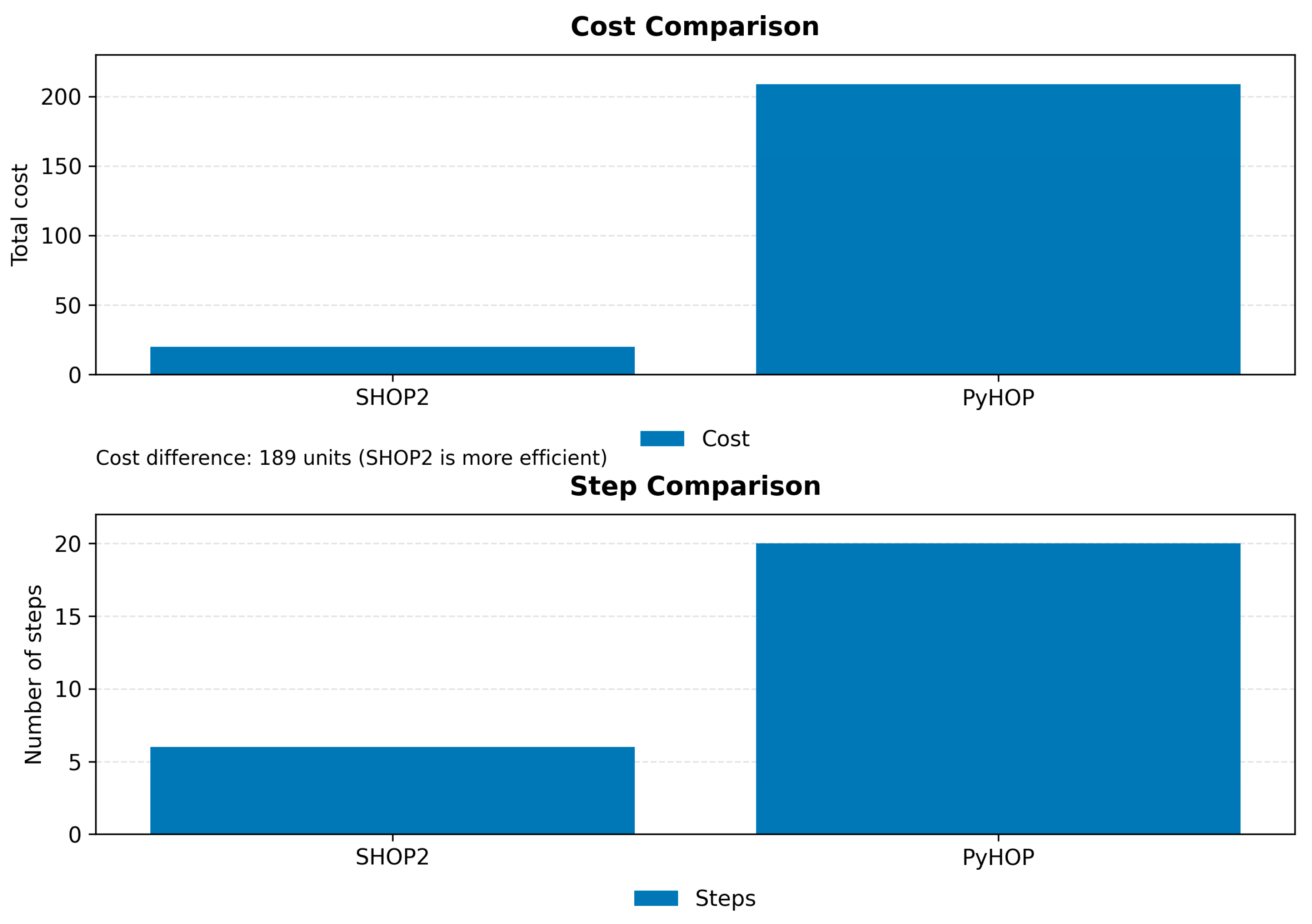 Table 7 summarizes the aggregated planner results across the three evaluated cases. In the UTP case, SHOP2 generated substantially lower-cost and shorter plans than PyHOP, with mean cost decreasing from 167.67 to 15.33 and mean number of steps from 16.67 to 4.00. In the