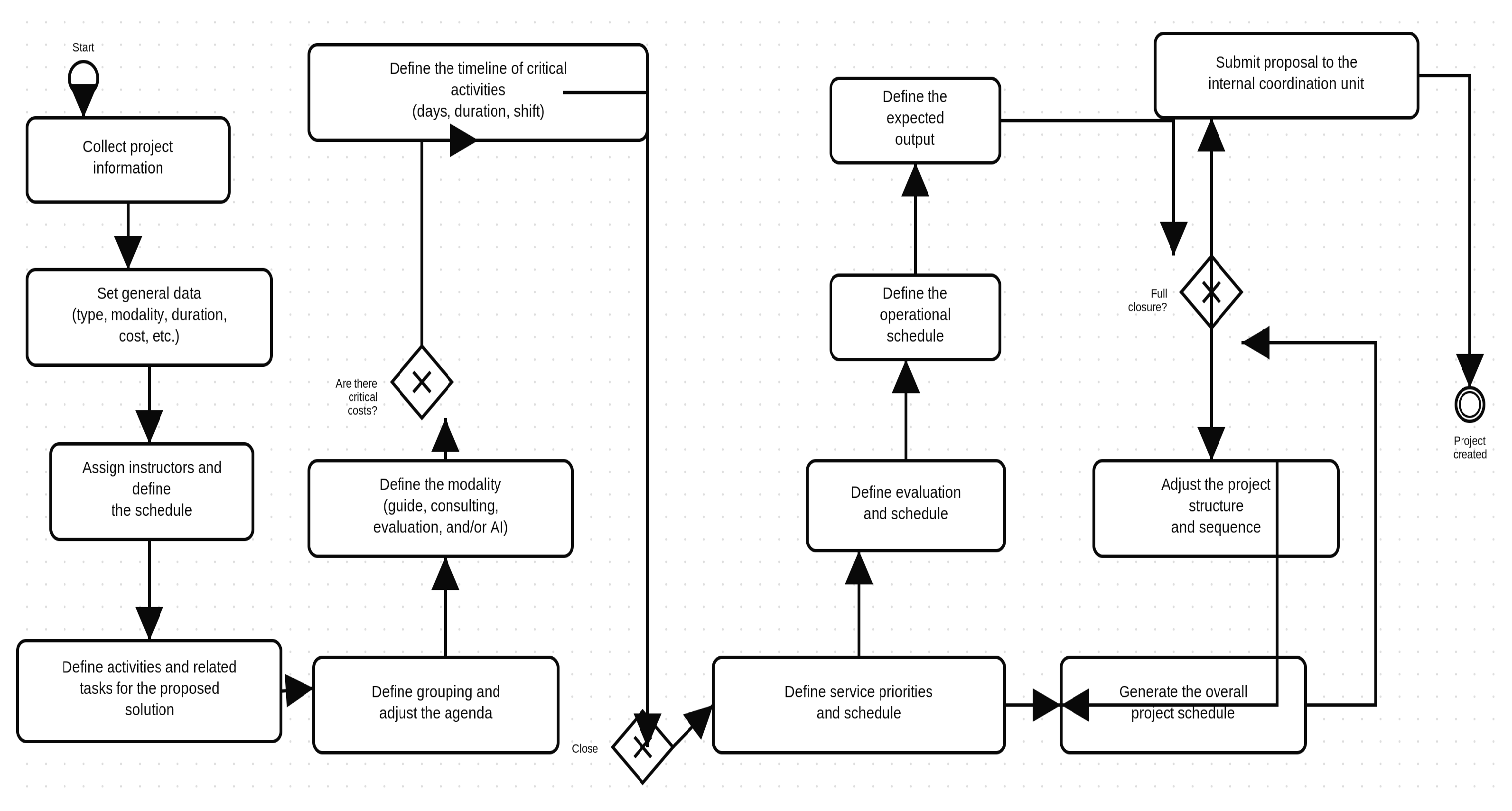 BPMN offers two distinct advantages for modeling university projects: (1) it provides a graphical, hierarchical representation of cause–effect dependencies, and (2) its XML serialization can be parsed to identify state transitions in each project component. These transitions encode conditional operations for decision flows, yielding sequential and parallel task executions with their respective constraints [
