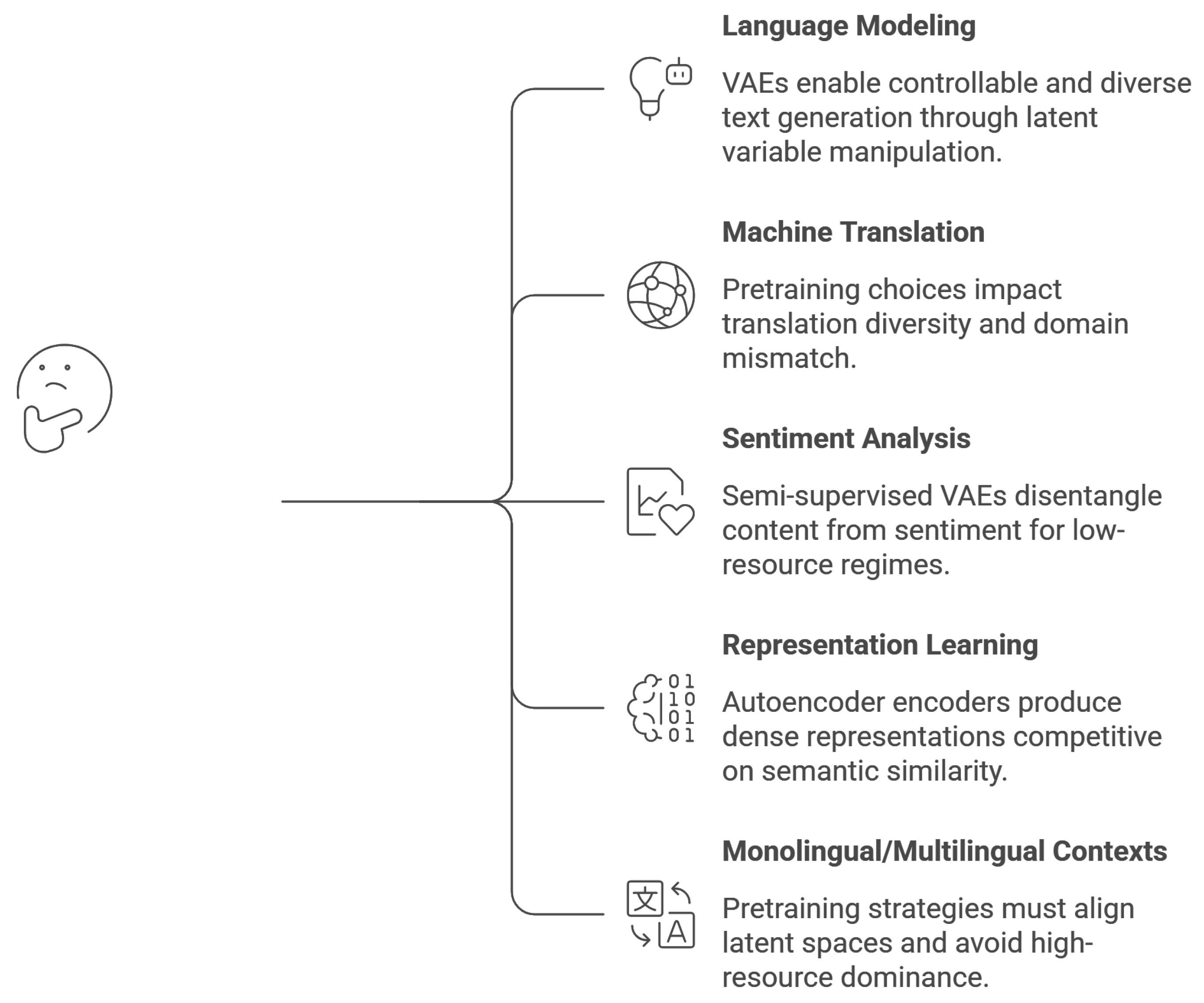 Limitations. Despite these strengths, several limitations persist. Latent representations often lack interpretability and reliability, particularly in the presence of powerful autoregressive decoders. Training instability, most notably posterior collapse in VAEs, remains a recurring challenge. In multilingual settings, autoencoder-based models are also sensitive to data imbalance, frequently favoring high-resource languages at the expense of typological diversity.